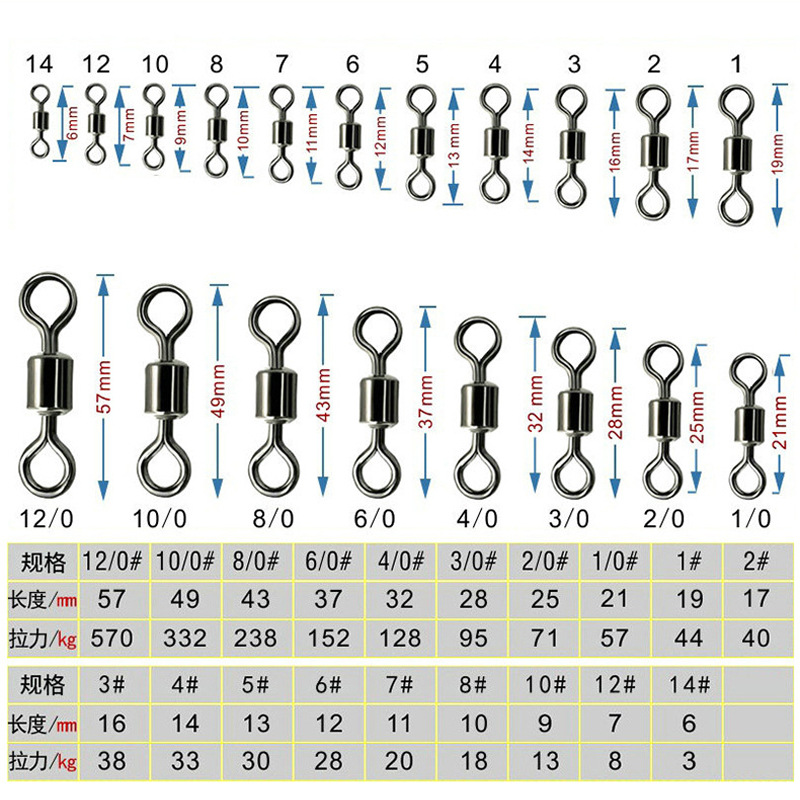 12# (8mm); 10# (9mm); 8# (10mm); 7# (11mm); 6# (12mm); 5# (13mm); 4# (14mm); 3# (16mm); 2# (17mm); 1# (19mm); 1/0# (21mm); 2/0# (23mm); 3/0# (28mm); 4/0# (32mm); 14#(6mm)