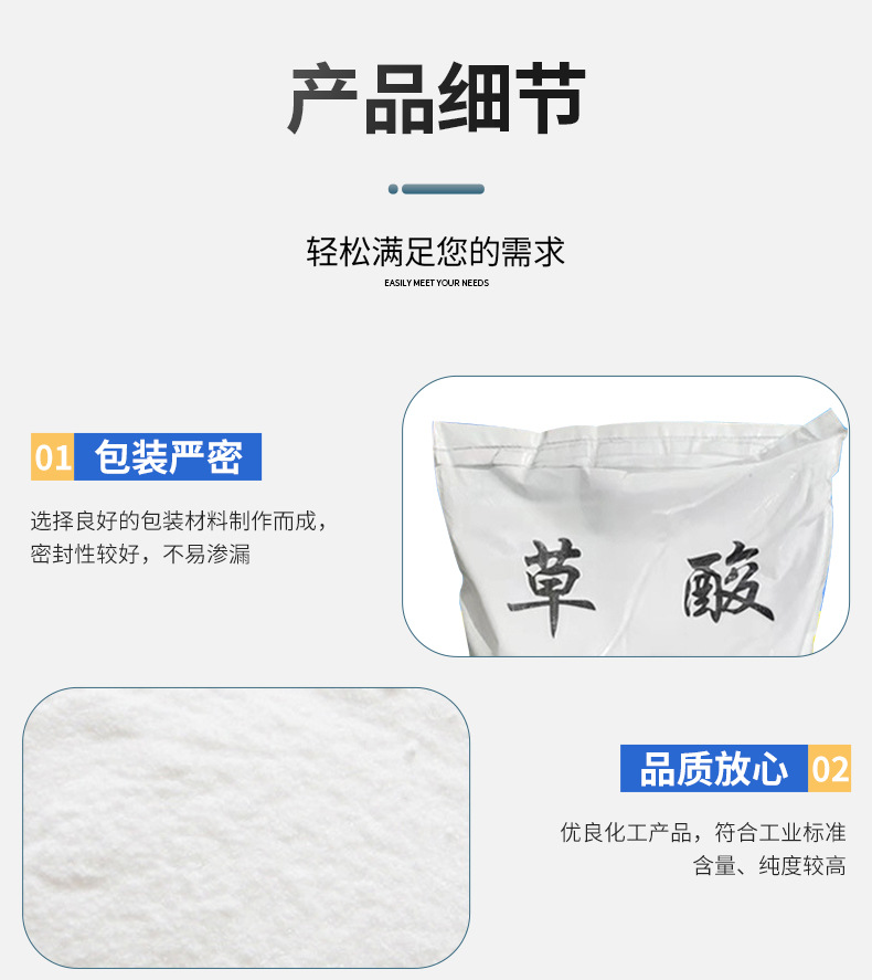 【Оксалиновая кислота】 Оксалиновая кислота доступна для немедленной поставки. Оксалиновая кислота используется для очистки сточных вод, нейтрализации кислот и щелочей, очистки и удаления накипи в промышленных условиях.