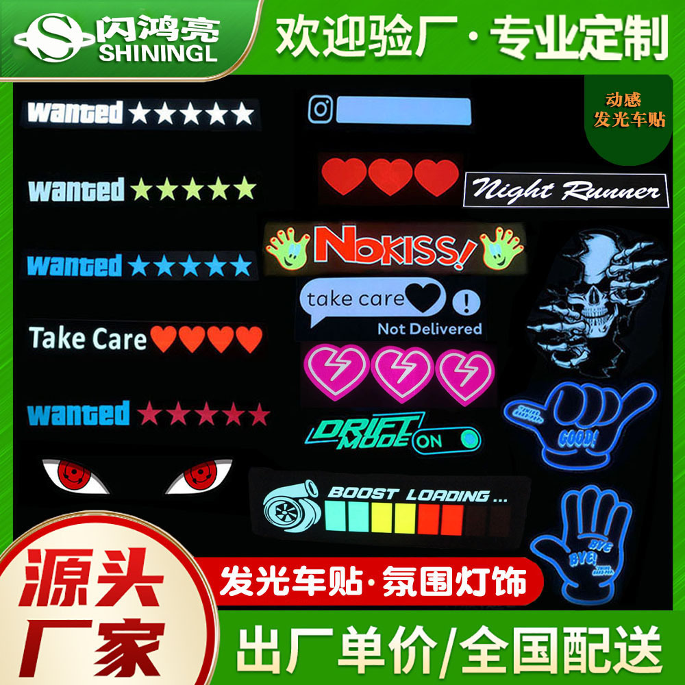 本司发光车贴更加美观,充满科技感,同时也增加了驾驶员的安全性;本司接受产品定制,如果您需要定制各种团队,车友会,公司LOGO等等,欢迎咨询