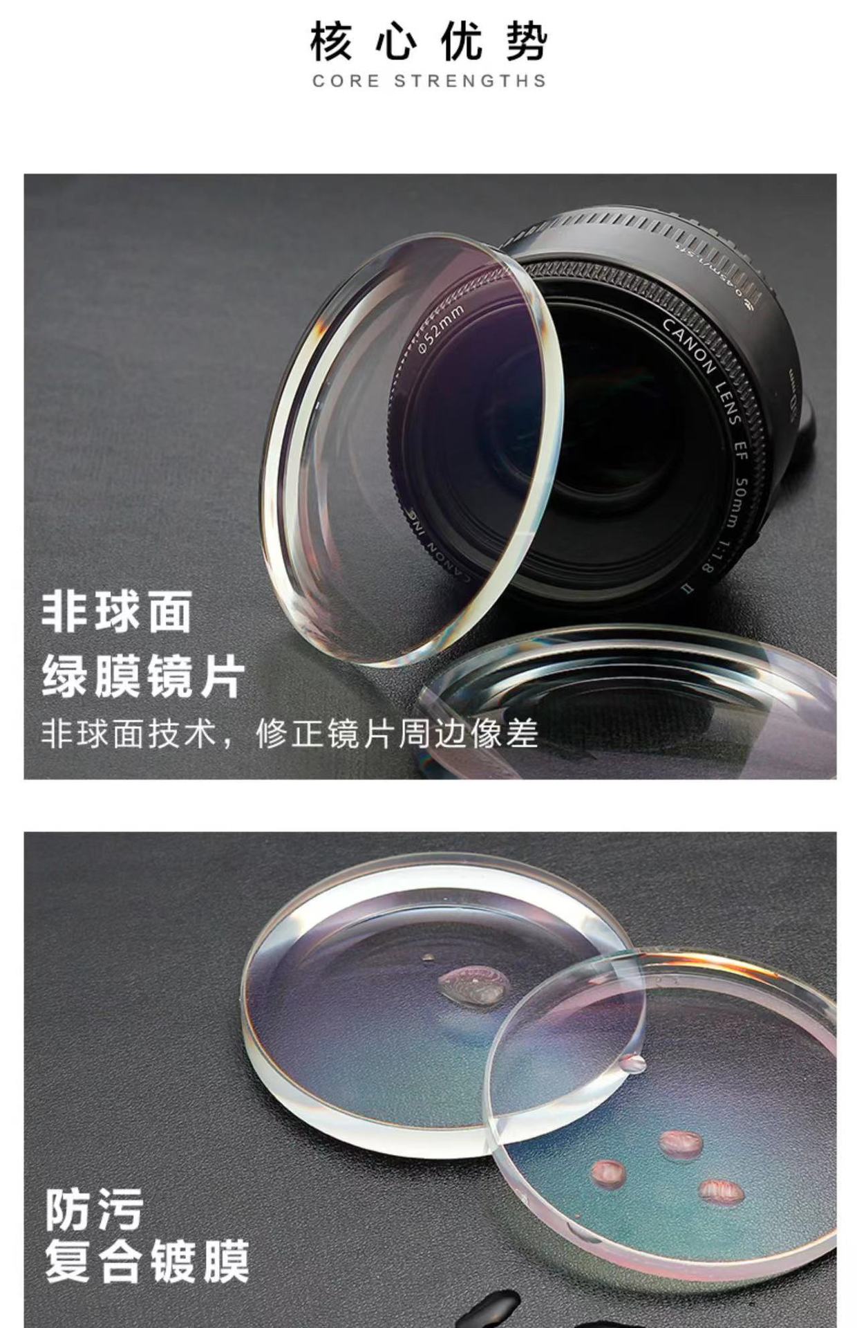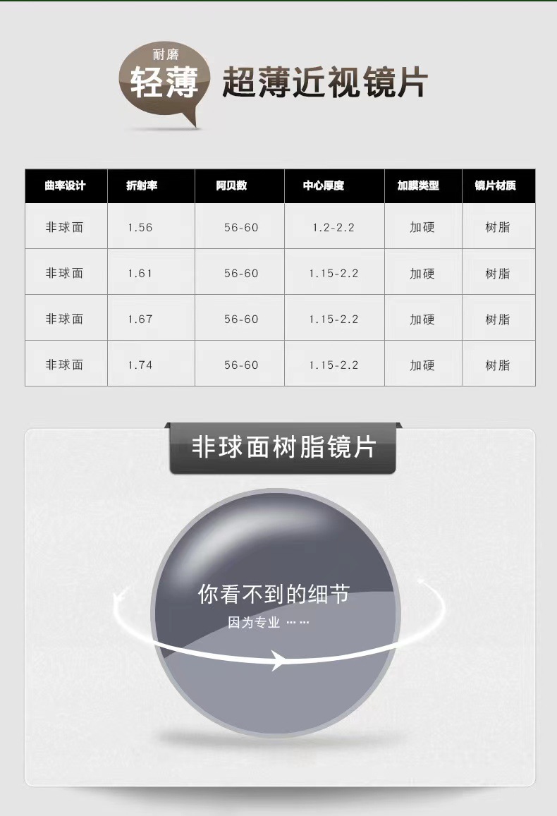 Асферическая поверхность из белой смолы 1,56 (белая упаковка), подходящая для окрашивания; 1,56 асферическая поверхность 0-800/50-200 (белая упаковка); 1.61 асферическая поверхность 0-1000/50-200 (белая упаковка); Асферическая поверхность 1,56 с защитой от синего света (белая упаковка); Асферическая поверхность 1,61 с защитой от синего света (белая упаковка); .156 серая асферическая поверхность (белая упаковка); Другие линзы