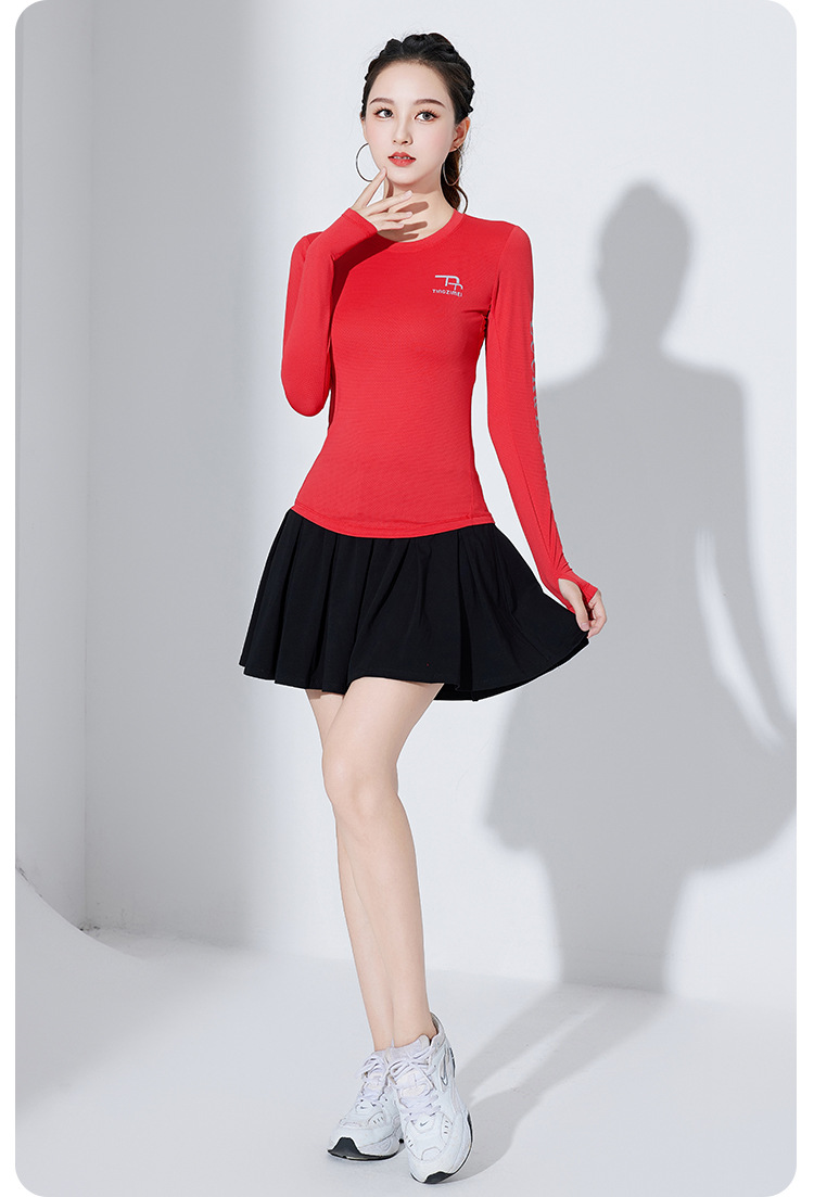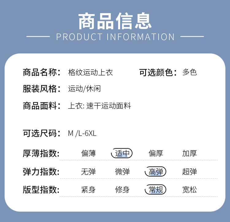 1.格纹长袖T恤上衣,上衣为优质速干面料,面料成分90%聚酯纤维,10%氨纶。