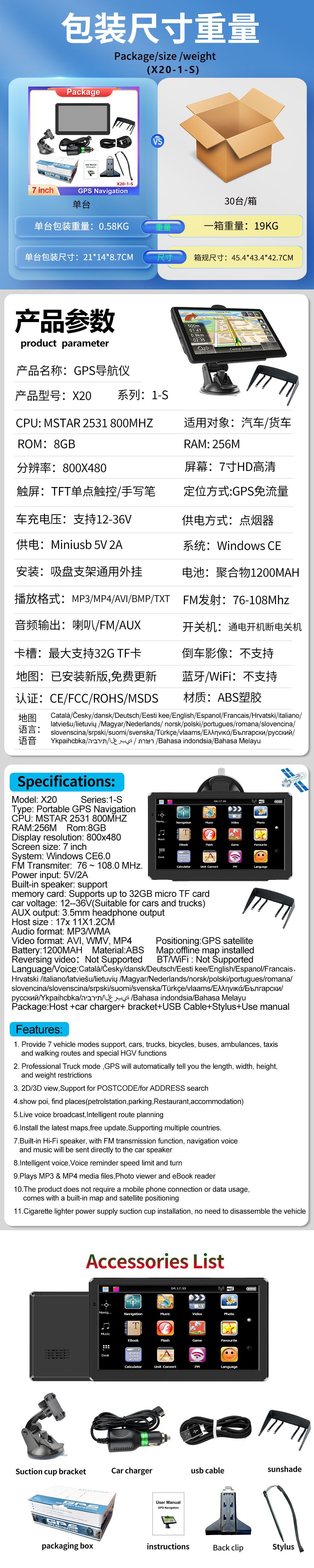 名称:7英寸8G 256MB高清屏便携式车载GPS导航仪