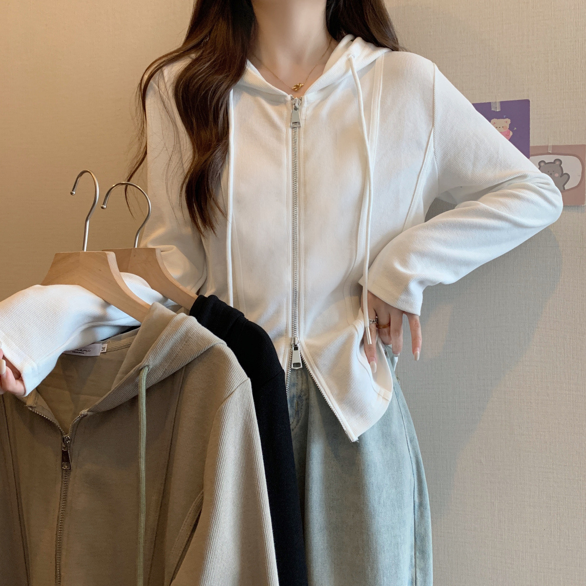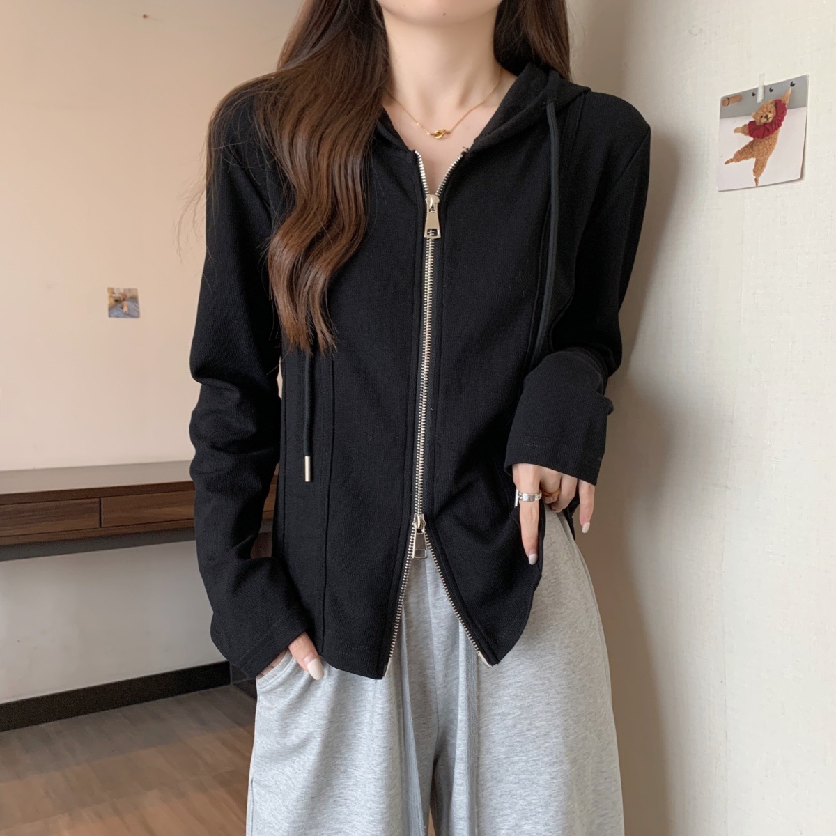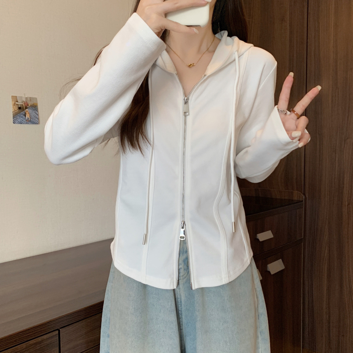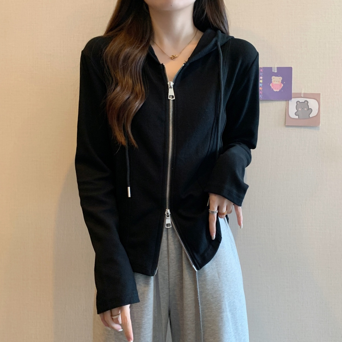 Женская футболка с капюшоном и длинными рукавами нестандартной формы, весна-осень 2024, новый женский свободный топ в корейском стиле для похудения с двойной молнией