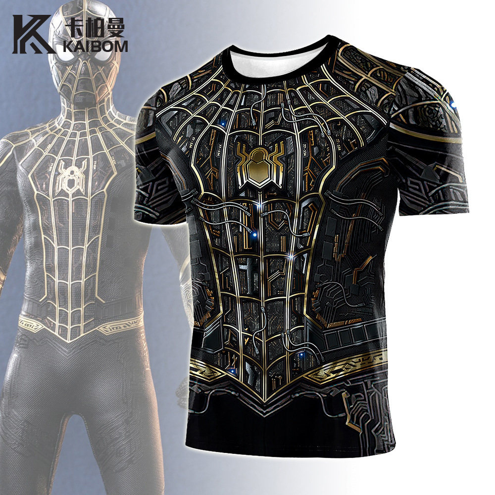 2025 новая модель для трансграничной внешнеторговой деятельности, обтягивающая футболка с короткими рукавами и принтом «паутина Человека-паука» в черно-золотом цвете, повседневная, спортивная, быстросохнущая для фитнеса