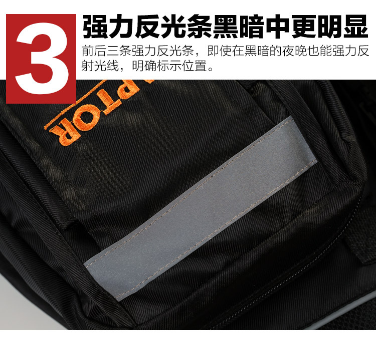 3.前后三条强力反光条,即使在黑暗夜晚也能清理反射光线,明确标示位置。