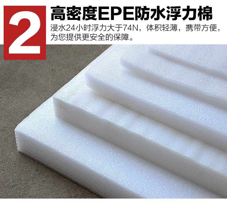 2.浮力材料采用高密度EPE防水浮力棉(珍珠棉)浸水24小时浮力大于74N,浮力强大体积轻薄,携带方便。