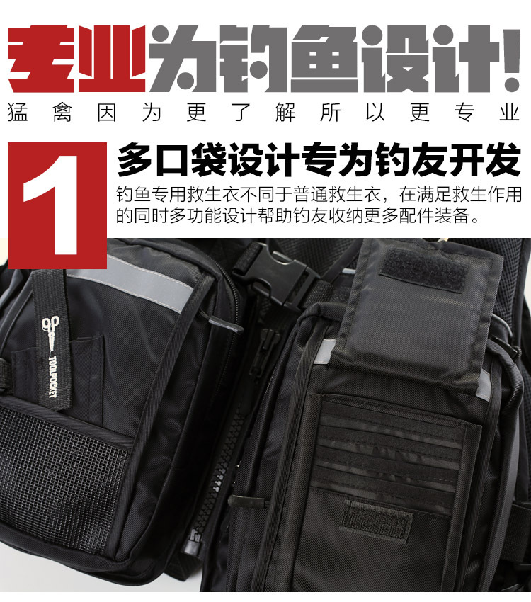 5.钓鱼专用救生衣不同于普通救生衣,在满足求生功能的同时,多口袋的功能设计可以帮助钓友收纳更多配件装备。