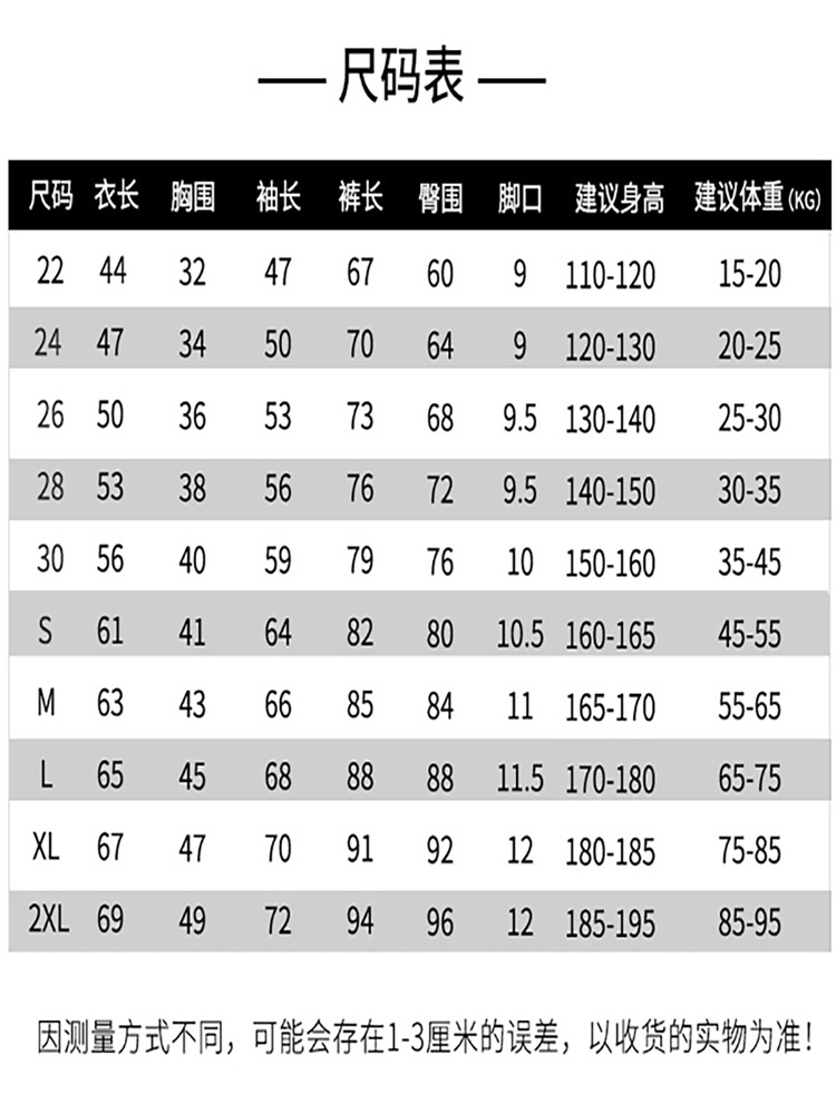 22 ярда (дети 120); 24 ярда (дети 130); 26 ярдов (дети 140); 28 ярдов (150 детей); 30 ярдов (дети 160); S (для взрослых 165); M (Взрослый 170); L Взрослый (Взрослый 175); XL (Взрослые 180); XXL (взрослые 185)
