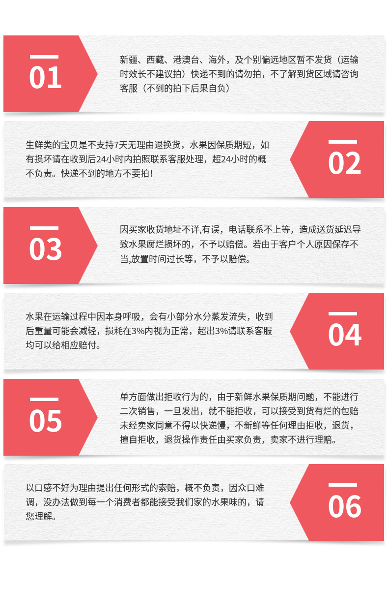 1、水果生鲜一旦发货不接受拒收,任何问题先收件,再联系客服。如有破损或腐坏等问题,请在商品签收24小时内拍照并联系客服处理。