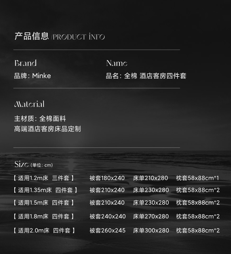 (1.2 кровати) 3 комплекта (пододеяльник 1.8x2.4 простыни 2.1x2.8 наволочки 58x88) Подходящие стеганые одеяла 160x220; (1,35 кровати) 4 комплекта (пододеяльник 2,1x2,4 простыни 2,3x2,8 наволочки 58x88)(подходит для стеганого одеяла 190x220); 1,5 кровати 4 комплекта (пододеяльник 2.1x2.4 простыни 2.3x2.8 наволочки 58x88)(подходит для стеганого одеяла 190x220); 1.8 Кровать 4 комплекта (пододеяльник 2.4x2.4 простыни 2.7x2.8 наволочка 58x88)(подходит для стеганого одеяла 220x220); 2 м кровать 4 комплекта (пододеяльник 2, 6x2, 4 простыни 3x2, 8 наволочка 58x88)(применимо 240x220)