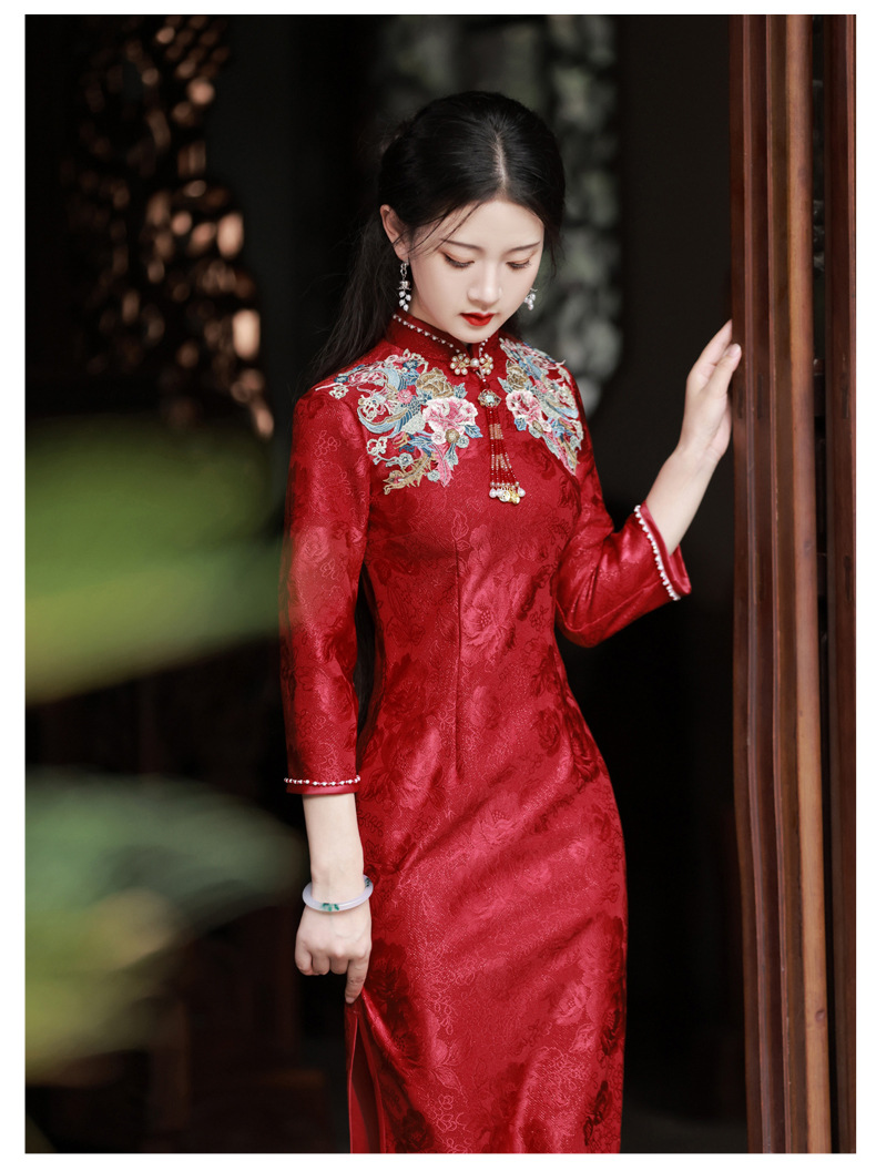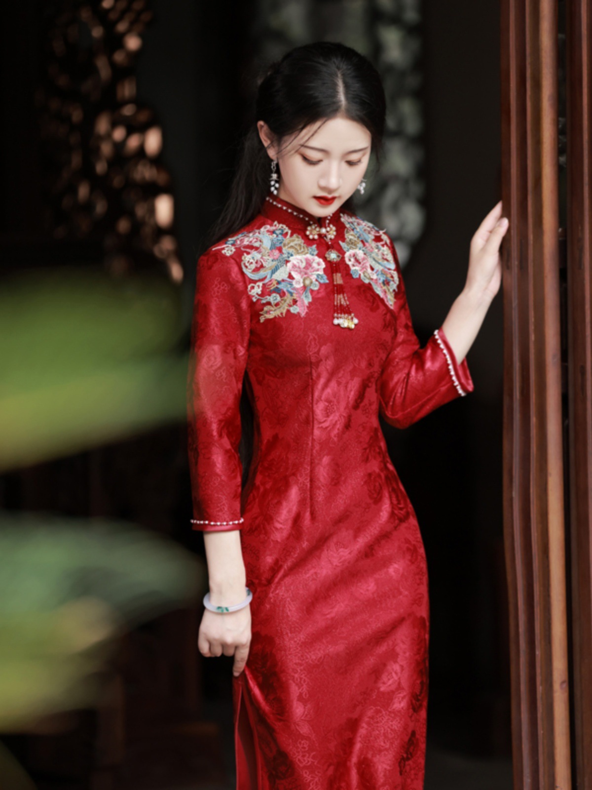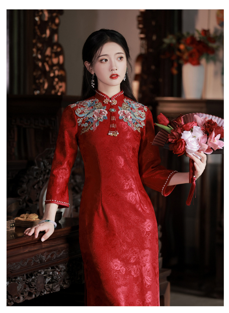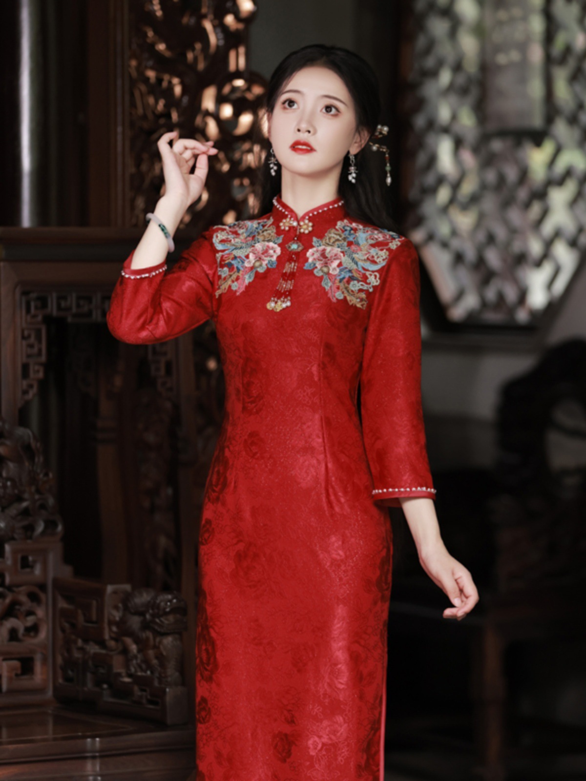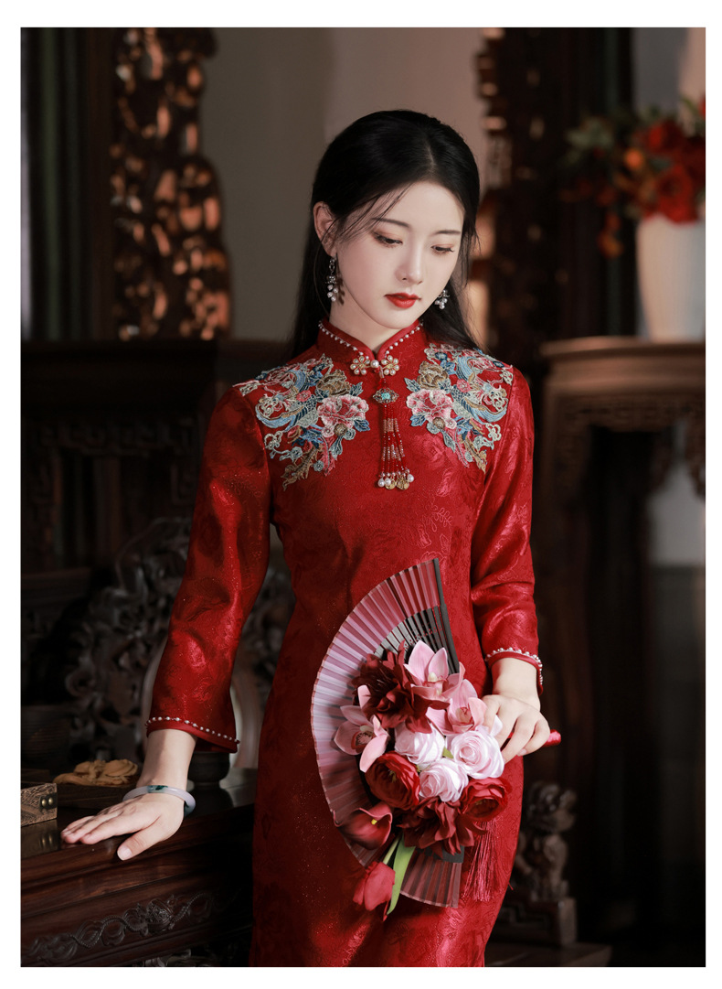 Красное тостовое платье Cheongsam, женское Новое высококачественное домашнее платье невесты с длинными рукавами на 2023 год, новое китайское платье для помолвки