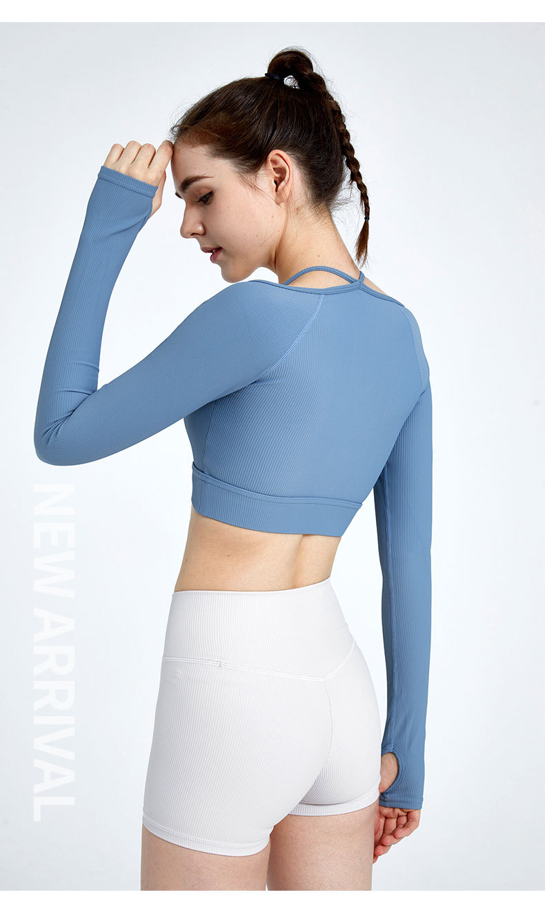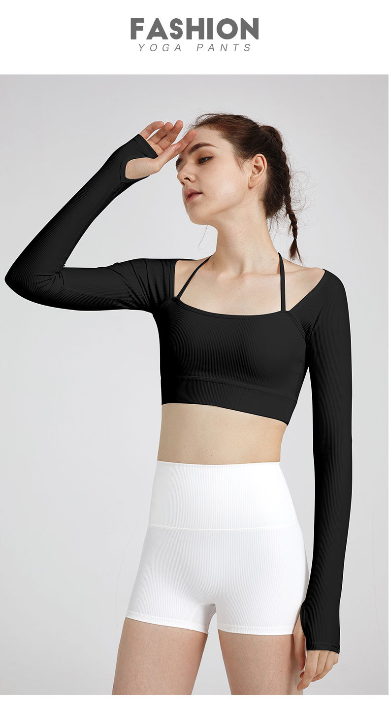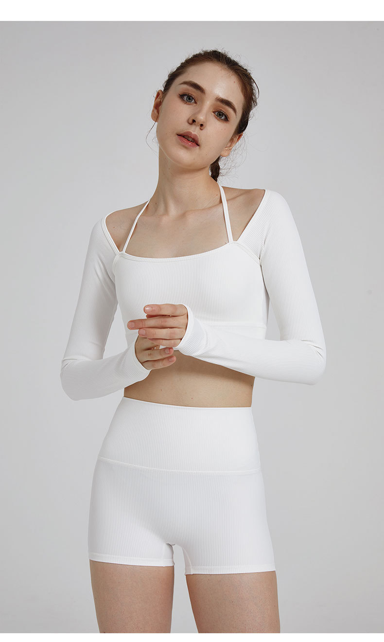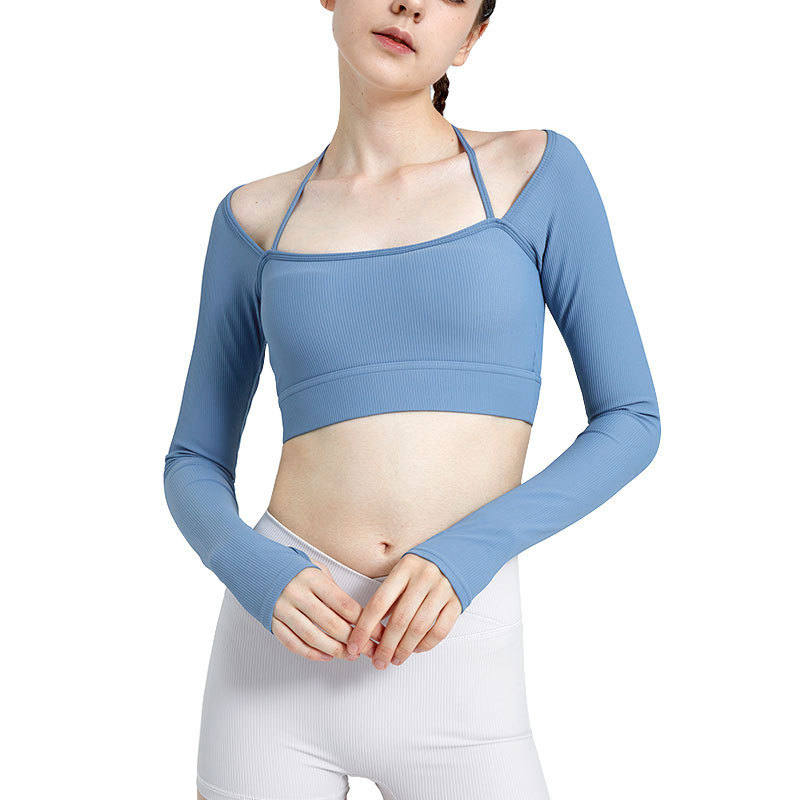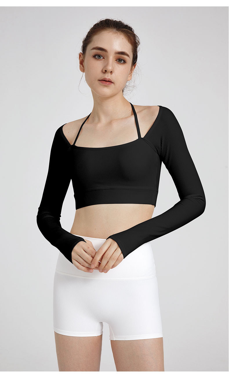 Популярный в Европе и Америке женский спортивный топ в рубчик с вырезом халтер, с подкладками для груди, быстросохнущая одежда для фитнеса, облегающий, приталенный топ для йоги с длинными рукавами