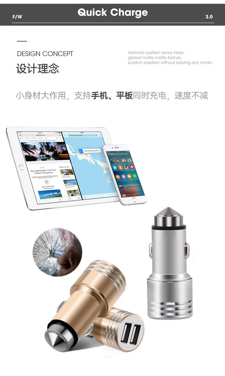 Безопасный молоток автомобильное зарядное устройство алюминиевый сплав одна Буксировка два 1A-2.4A Автомобильная зарядная головка производители оптом