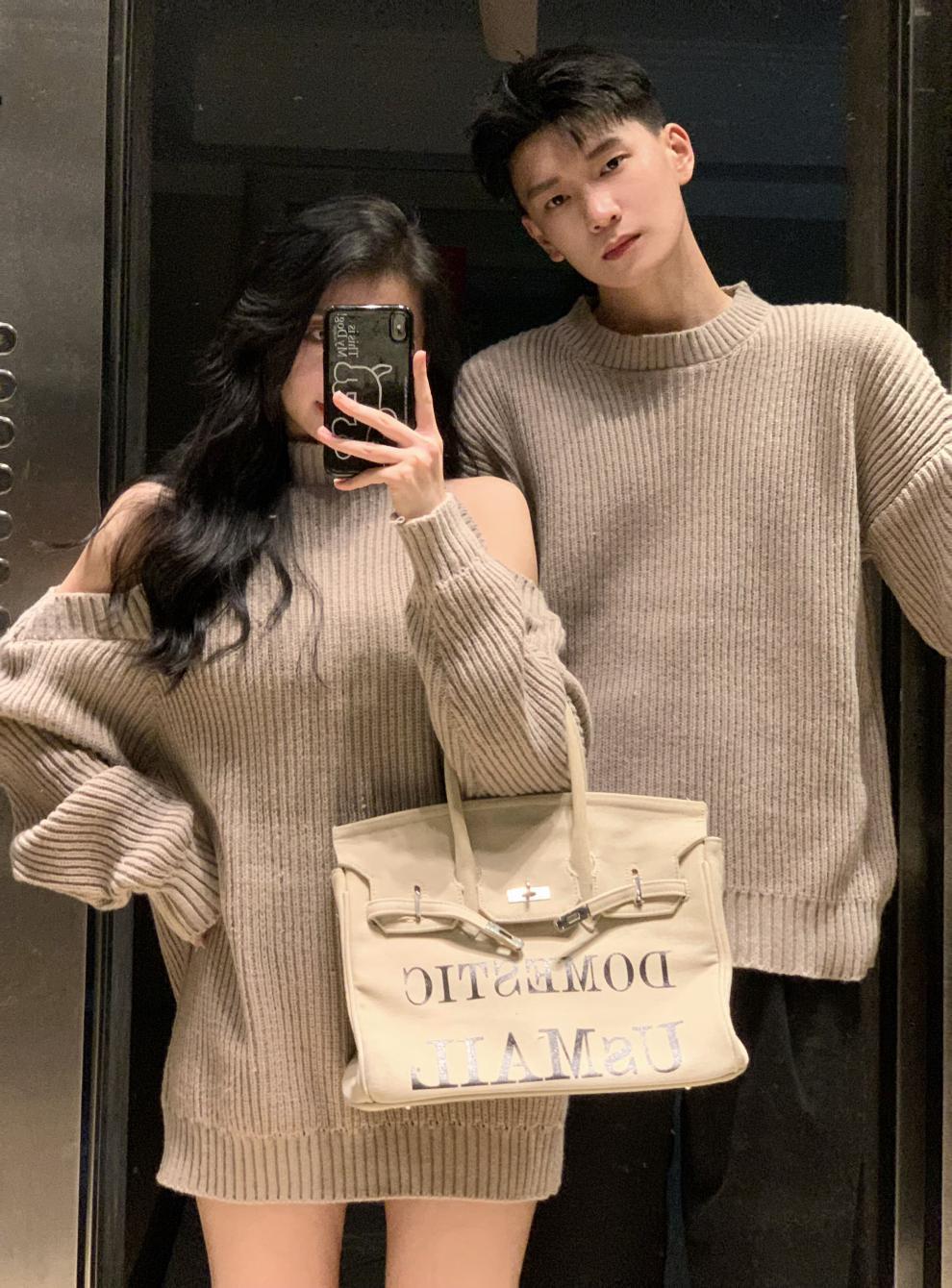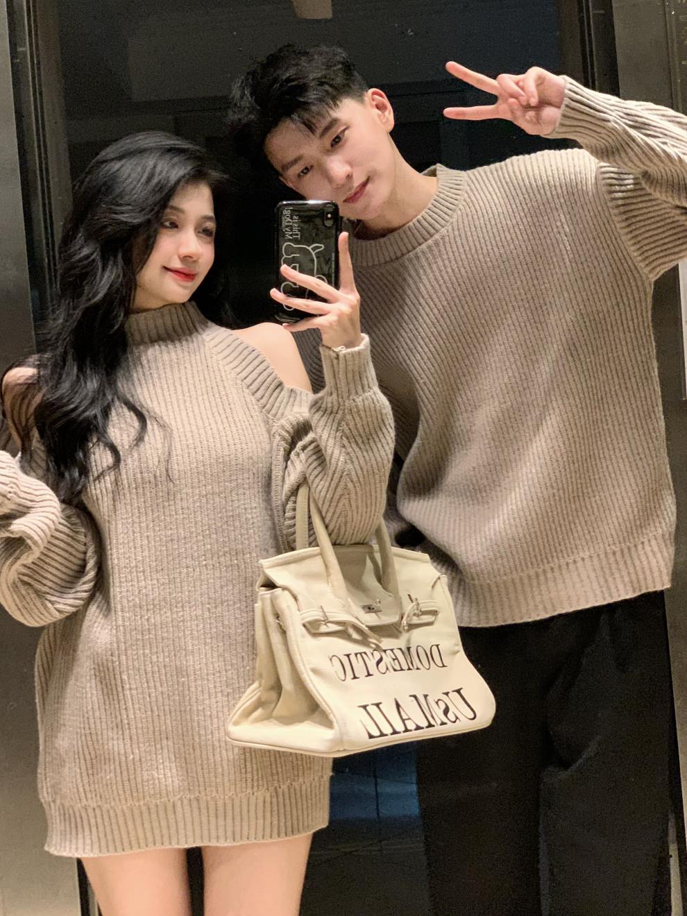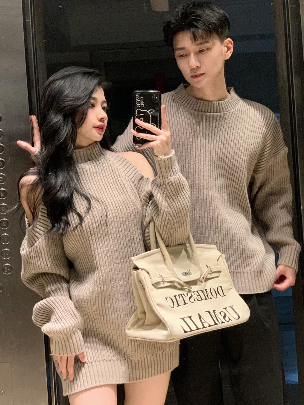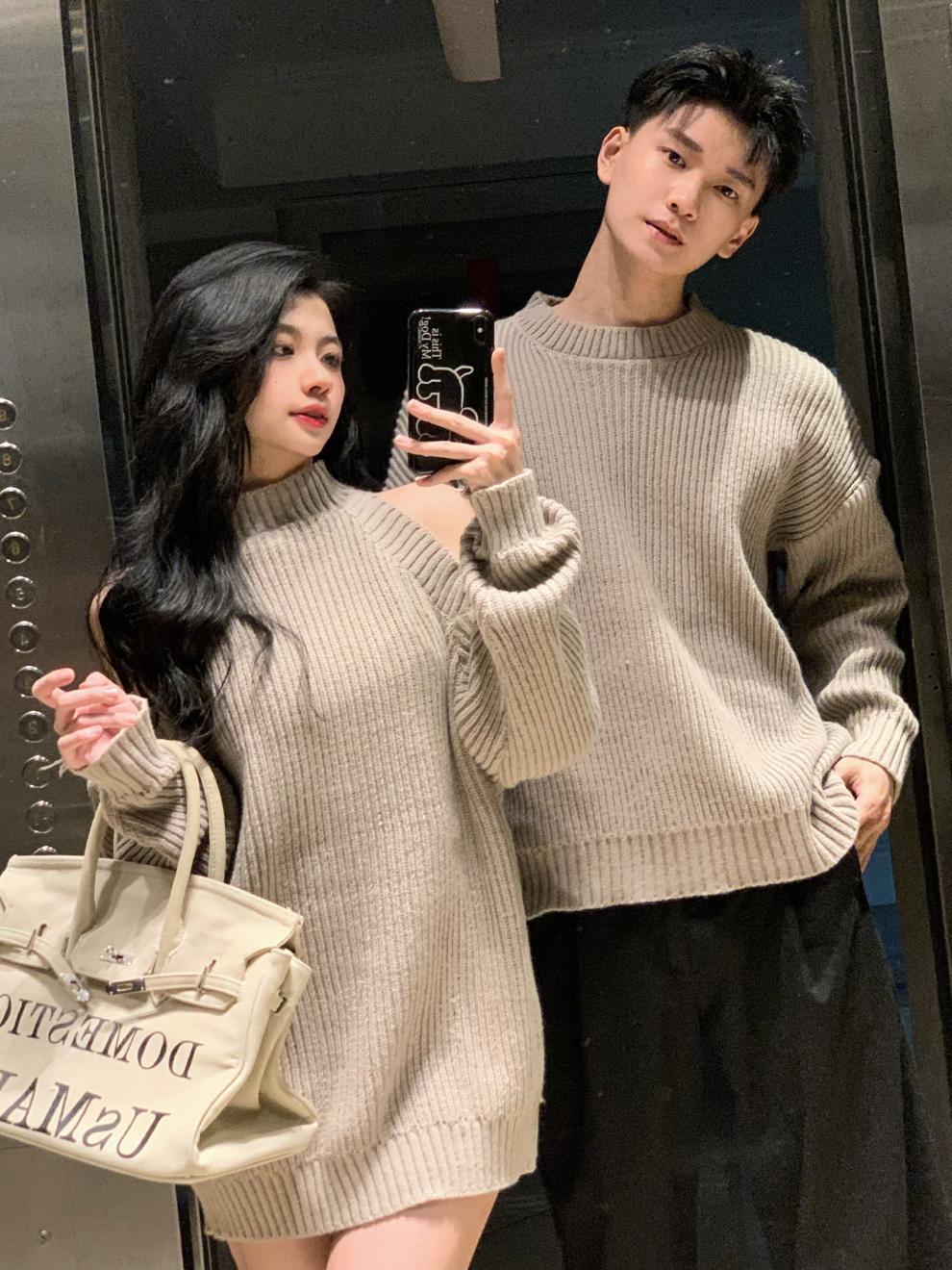 Пара осень-зима новый женский свитер с открытыми плечами юбка Мужской пуловер круглый вырез вязаный свитер