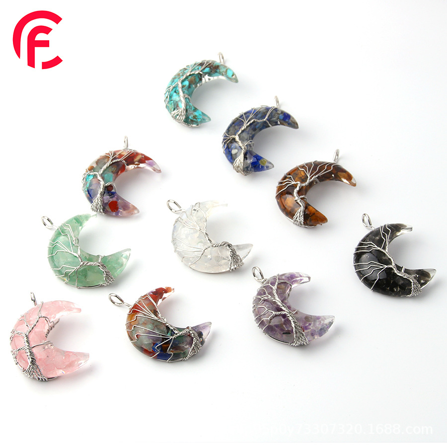 Природный камень кристалл луна обмотки линии жизни Дерево гравий кулон с смолы нержавеющей стали цепи зубы ожерелье ювелирные изделия
