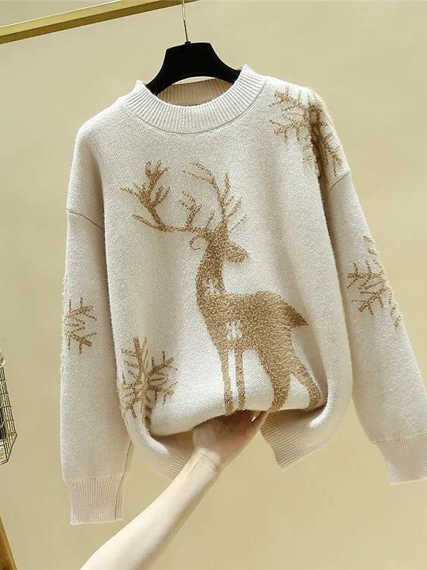 Женский свитер-пуловер в корейском стиле, осень-зима 2025, новый дизайн с жаккардовым рисунком оленя, круглый вырез, свободный крой, модная трикотажная одежда