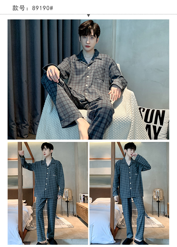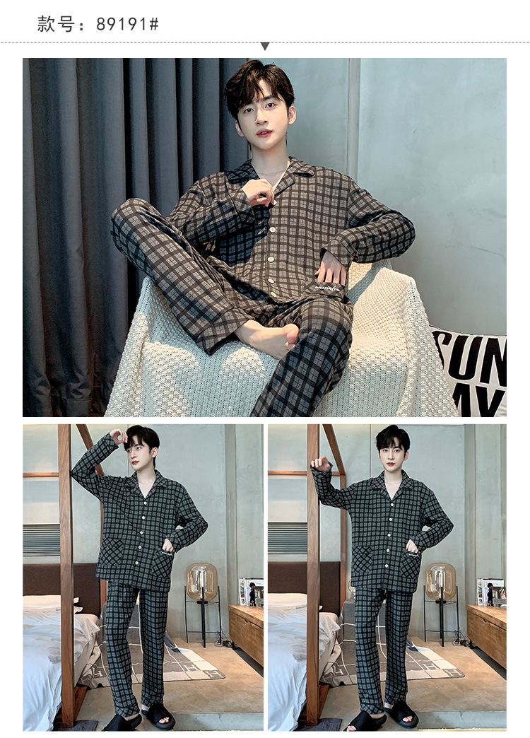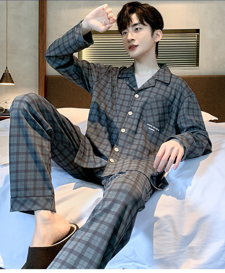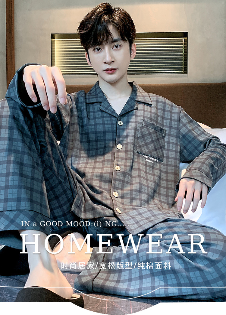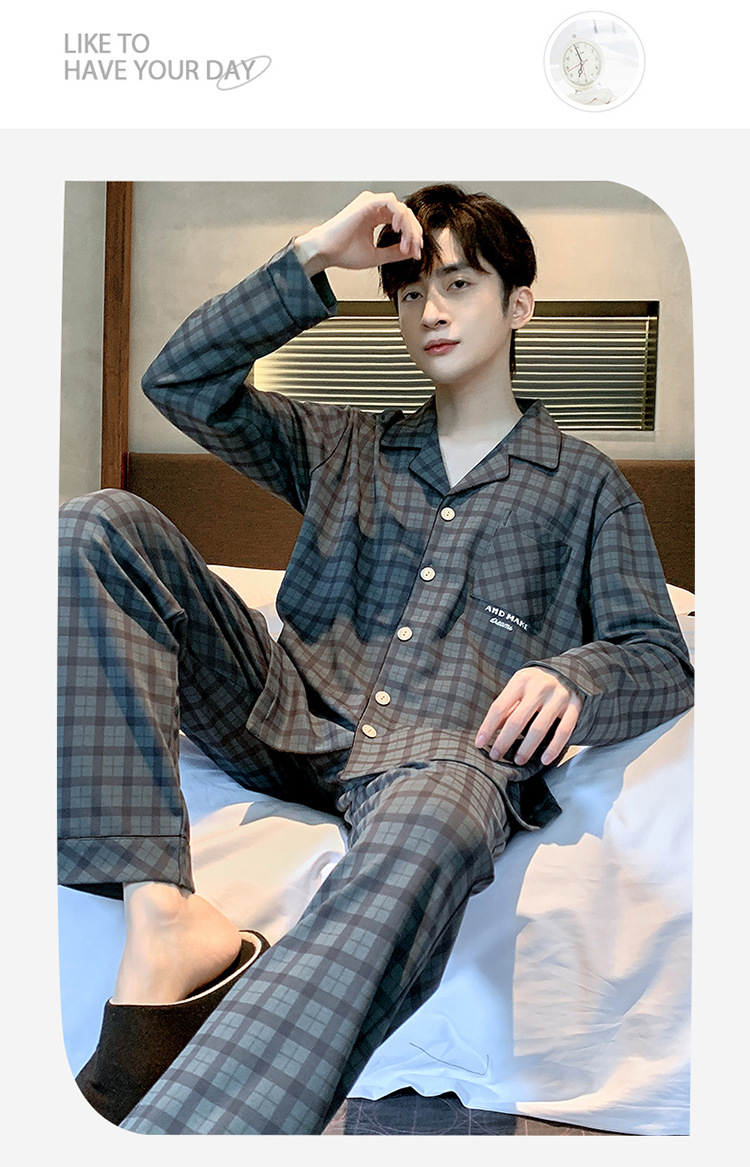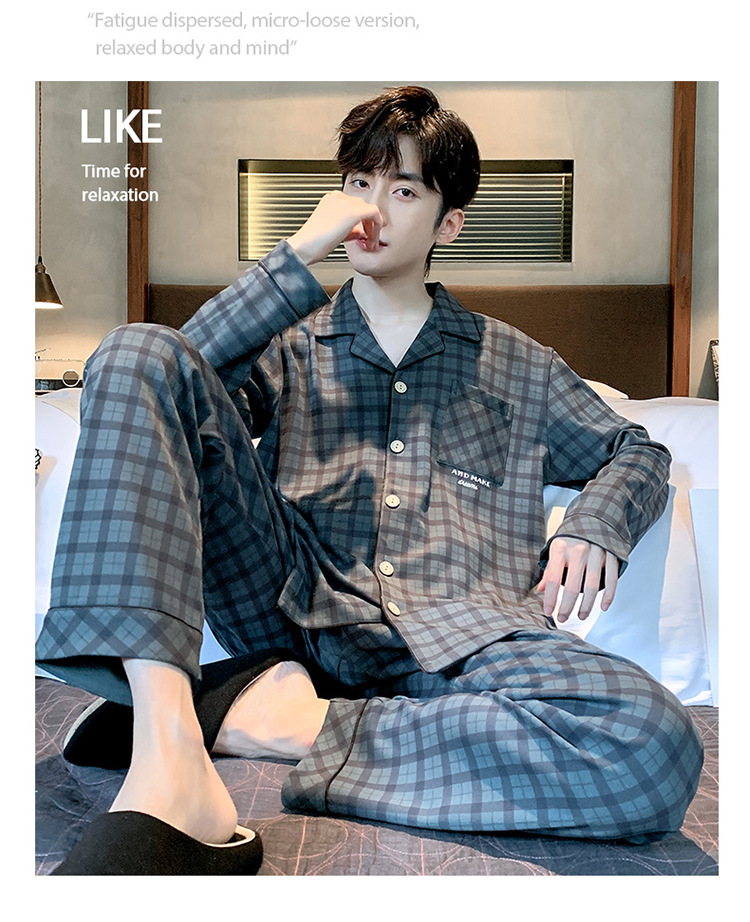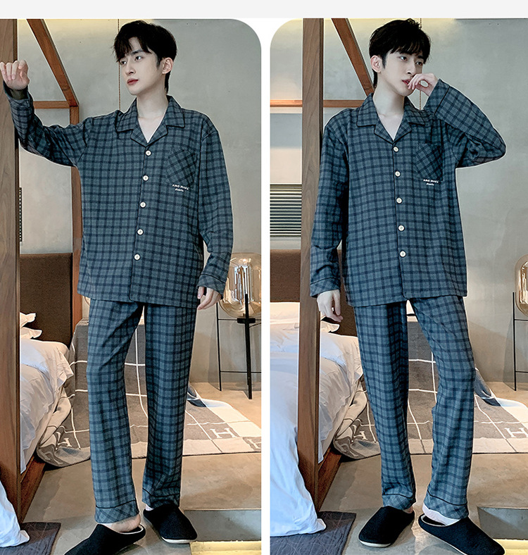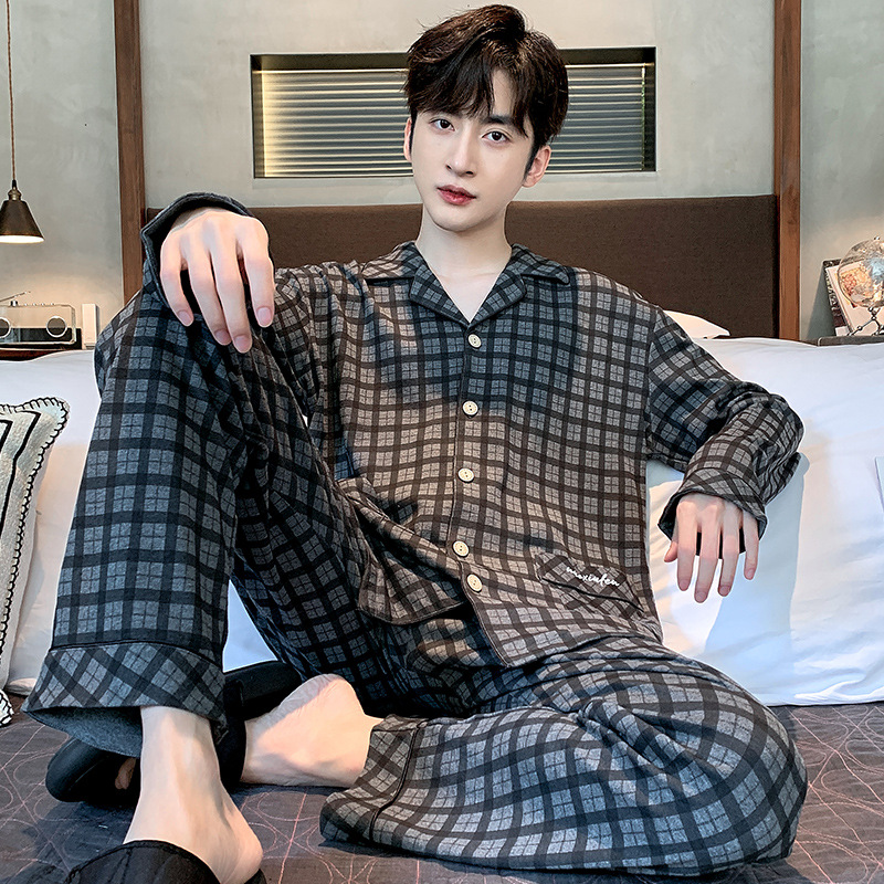 Пижама Мужская весна-осень Повседневный Кардиган с длинными рукавами Клетчатая Мужская осенне-зимняя тонкая Домашняя одежда больших размеров