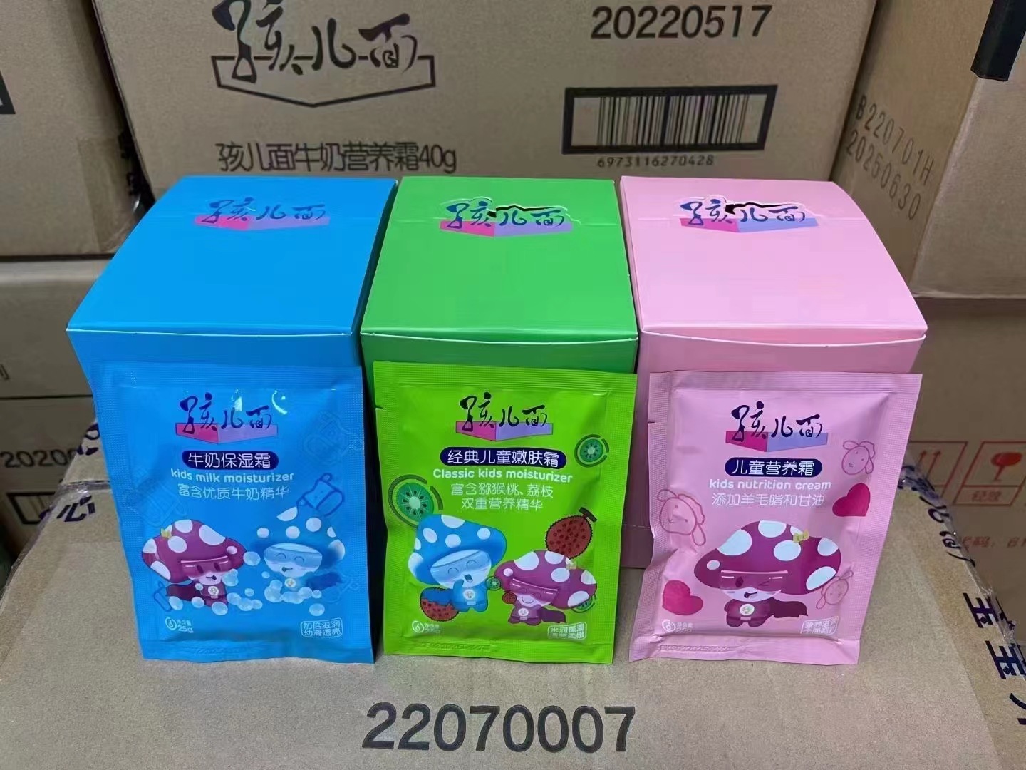 40 г бутылка молочного питающего крема; 40 г флакон детского крема для омоложения кожи; 40 г флакон детского увлажняющего крема; 25 г мешок молока Питание крем; 25 г мешок детский омолаживающий крем; 25 г пакет детский питательный крем