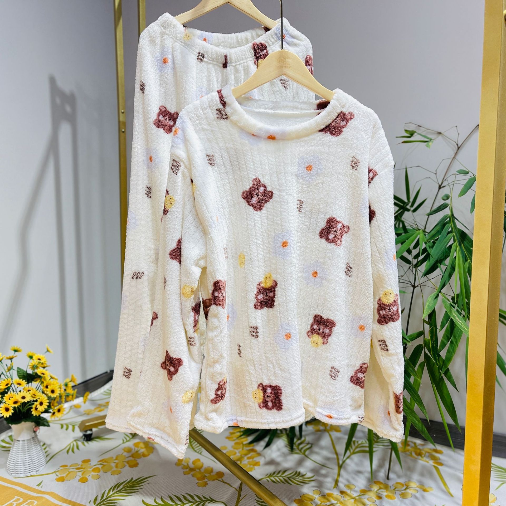 Новая маленькая Цветочная мягкая и удобная домашняя одежда, Пижамный костюм с длинными рукавами и круглым вырезом, Женская милая, приятная для кожи утепленная одежда с медведем