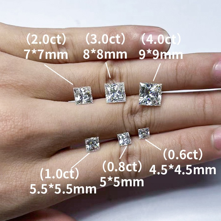 4*4mm/0.4ct; 4.25*4.25mm/0.5ct; 4.5*4.5mm/0.6ct; 5*5 мм/0,8 карата; 5,5*5,5 мм/1 карат; 6*6mm/1.2ct; 6.5*6.5mm/1.5ct; 7*7 мм/2 карата; 8*8 мм/3 карата