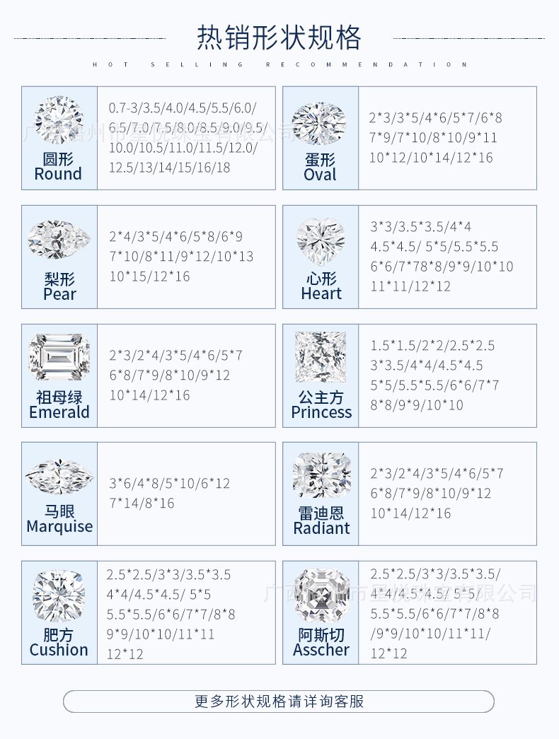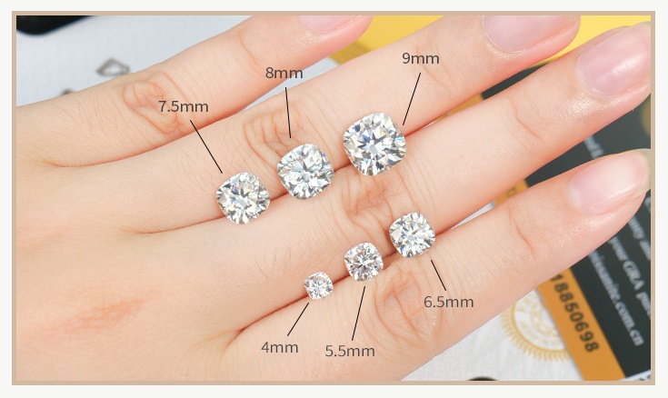 4.5*4.5mm/0.5ct; 5*5mm/0.6ct; 5.5*5.5mm/0.8ct; 6*6mm/1ct; 7*7mm/2ct; 8*8mm/2.5ct; 8.5*8.5mm/3ct; 4.5*4.5mm/0.5ct