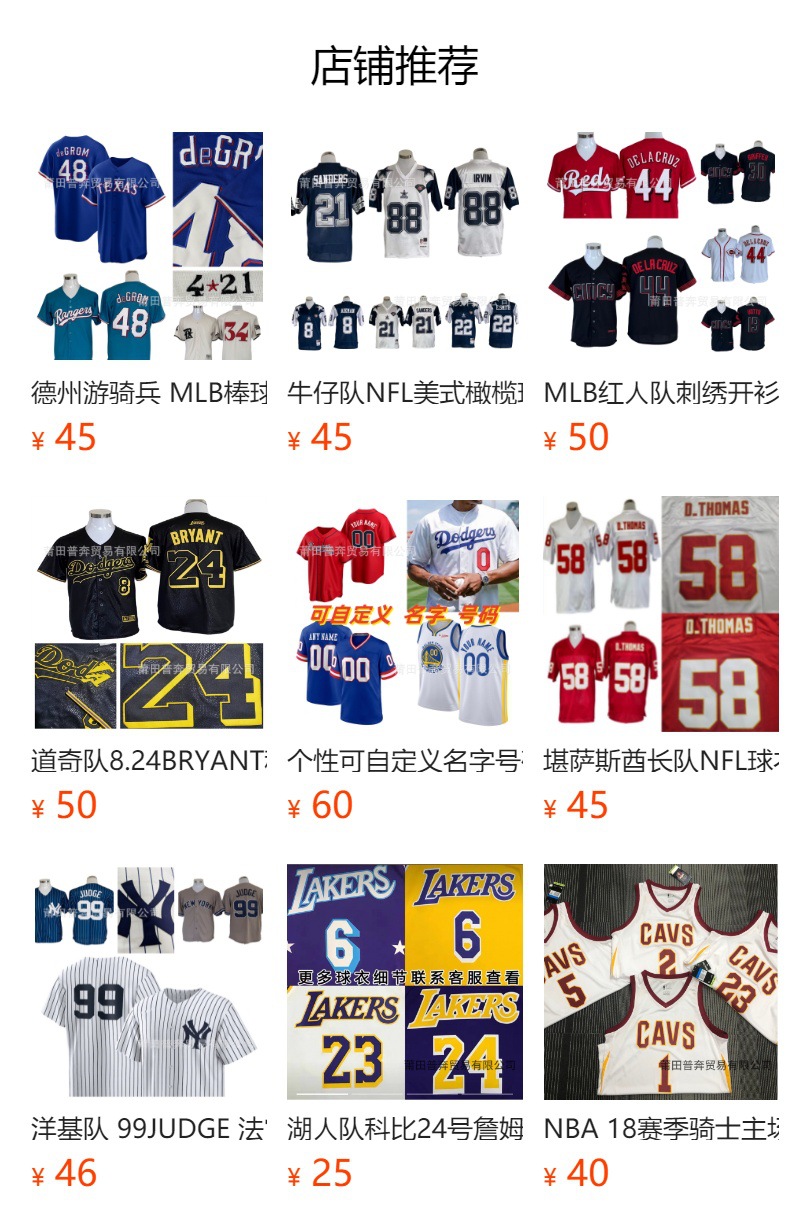 本店主营MLB、NFL、NBA、NHL各种版本的球衣,球裤,球帽,款式齐全! 价格实惠!质量保证! 支持一件代发! 支持国际代发!