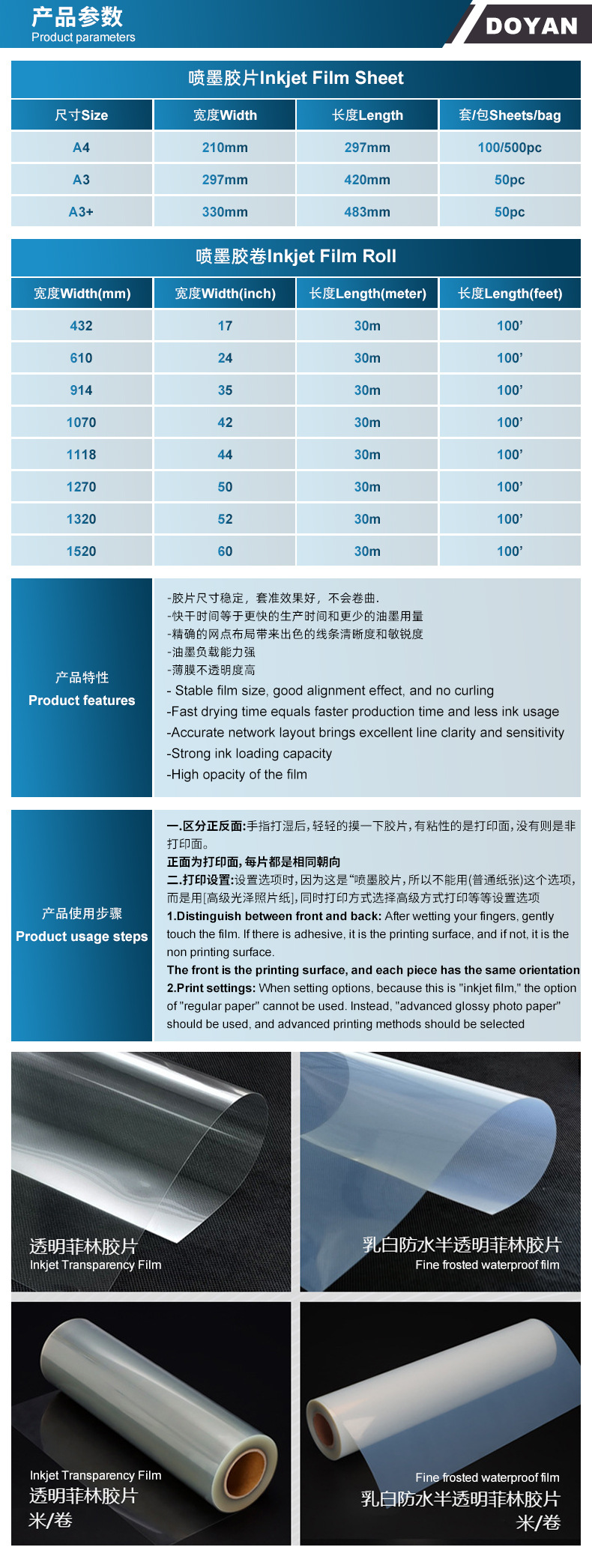 Неводостойкий прозрачный А4 210*297мм; Неводостойкий прозрачный А3 297*420мм; Неводостойкий прозрачный А3+ 330*483мм; Водостойкий молочно-белый А4 210*297мм; Водостойкий молочно-белый А3 297*420мм; Водостойкий молочно-белый А3+ 330*483мм; Рулон пленки водонепроницаемый 33см*30м; Рулон пленки водонепроницаемый 61см*30м; Рулон пленки водонепроницаемый 107см*30м; Рулон пленки не является водонепроницаемым 33см*30м.; Рулон пленки не является водонепроницаемым 61см*30м.; Рулон пленки не является водонепроницаемым 107см*30м.; A4 углеродная лазерная двусторонняя матовая пленка; Тонер для лазерного принтера формата A3, двусторонняя матовая пленка