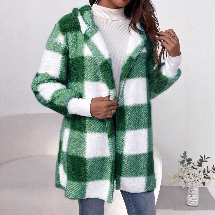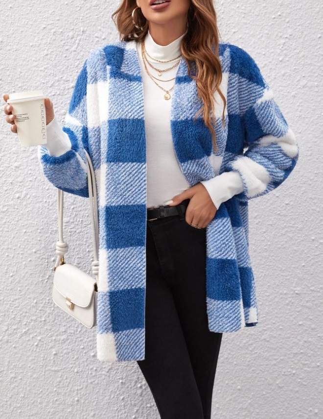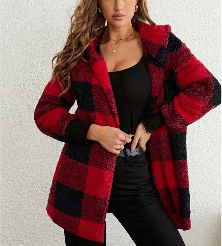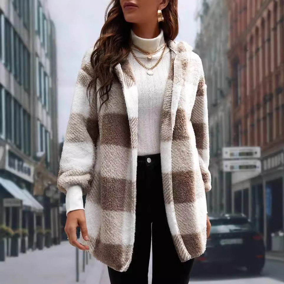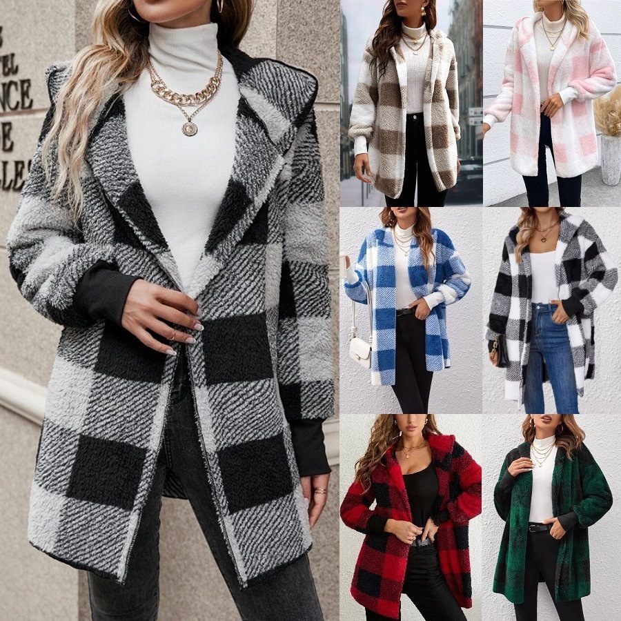 Трансграничная женская одежда Amazon взрывайте европейские и американские осенние и зимние шапки в клетку теплый топ средней и длинной плюшевый кардиган