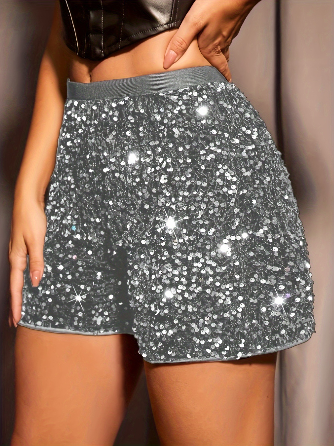Модные облегающие шорты-хит продаж 2025 года в европейском и американском стиле, весна-лето, с пайетками, однотонные черные, со средней посадкой, эластичные, сексуальные, прямые