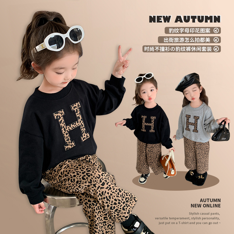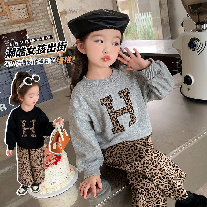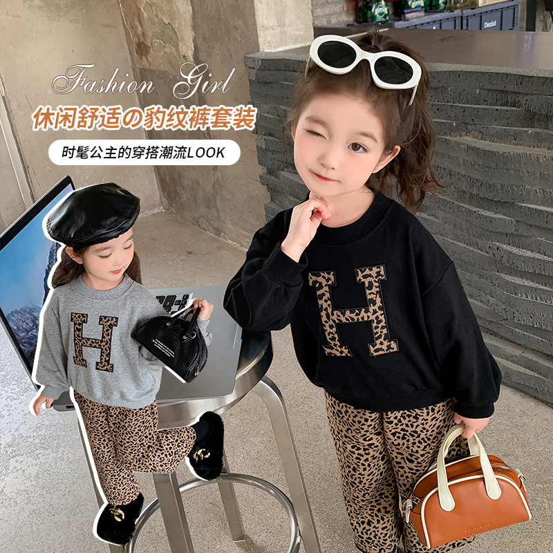 Красный костюм для девочек весна и осень новая женская мода на газ хлопчатобумажный свитер для детей леопардовый с широким принтом брюки из двух частей