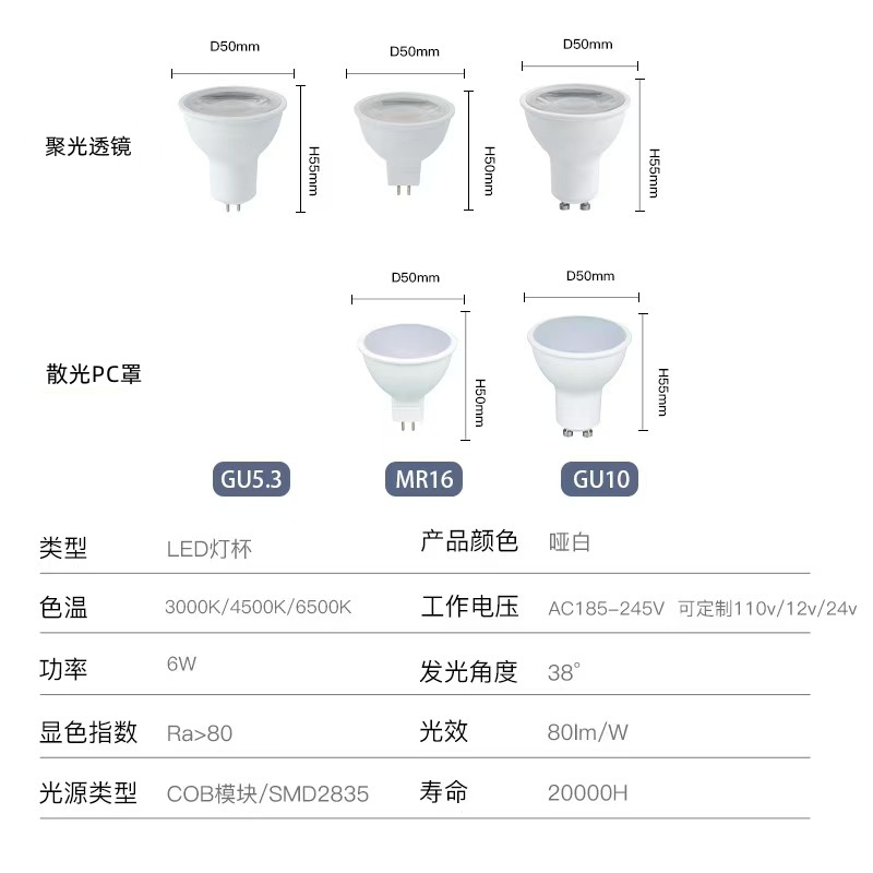 GU10-6w-концентрирующий 220В; MR16-6Вт-концентрирующий 220В; GU10-6w-Астигматизм 220В; MR16-6w-Астигматизм 220В; GU10-6w-концентрированный постоянный ток света 85-265В; GU5.3-6 Вт-концентрированный постоянный ток света 85-265 В; GU10-6w-Астигматизм постоянного тока 85-265В; GU5.3-6 Вт-Астигматизм постоянный ток 85-265 В; GU10-10w-концентрированный постоянный ток 85-265В (диаметр 50*высота 65мм); GU10-10w-астigmatic, постоянный ток, 85-265В (диаметр 50*высота 65 мм); MR16-5w-концентрированный свет 12 В/ACDC; GU10-5w-концентрированный свет 12В/ACDC