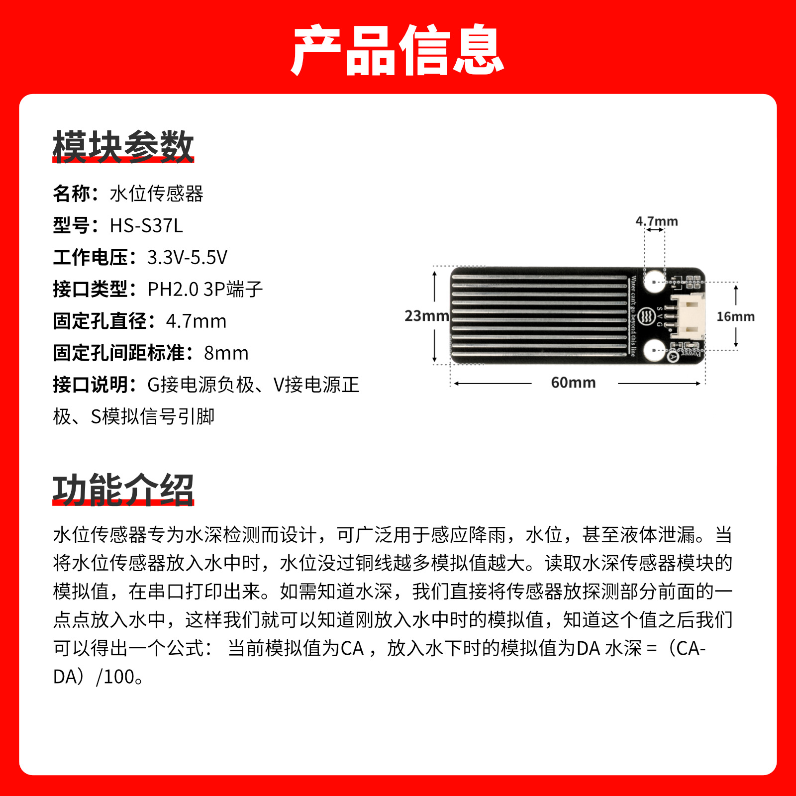 - 接口说明:G接电源负极、V接电源正极、S模拟信号输出引脚