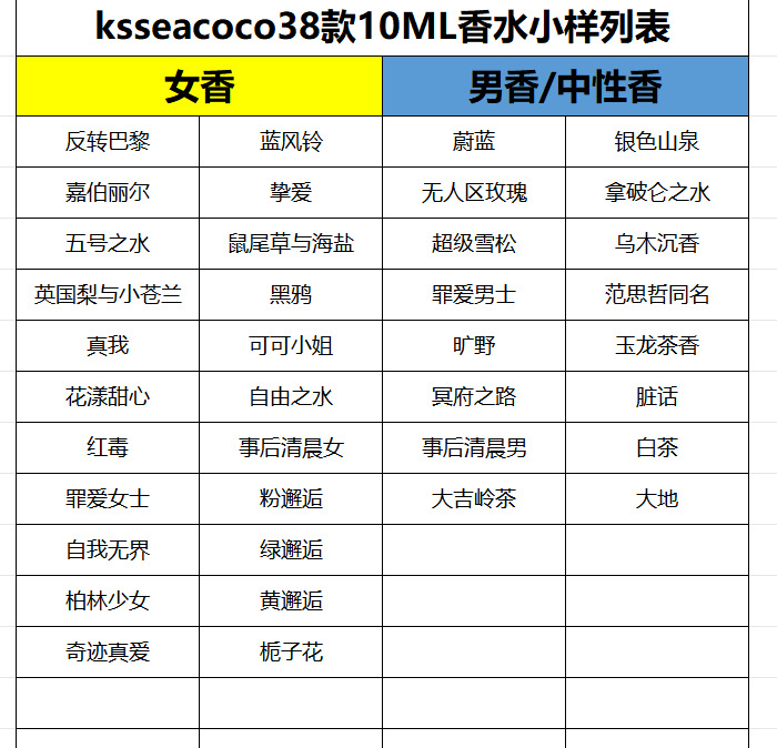 Ksseacoco香水小样现货香型38款,推荐零售价格29-39.