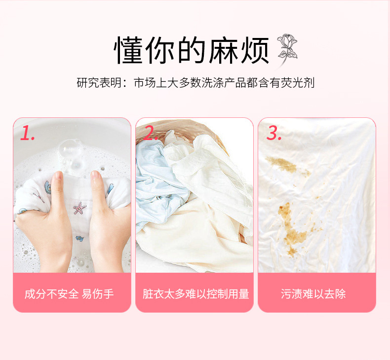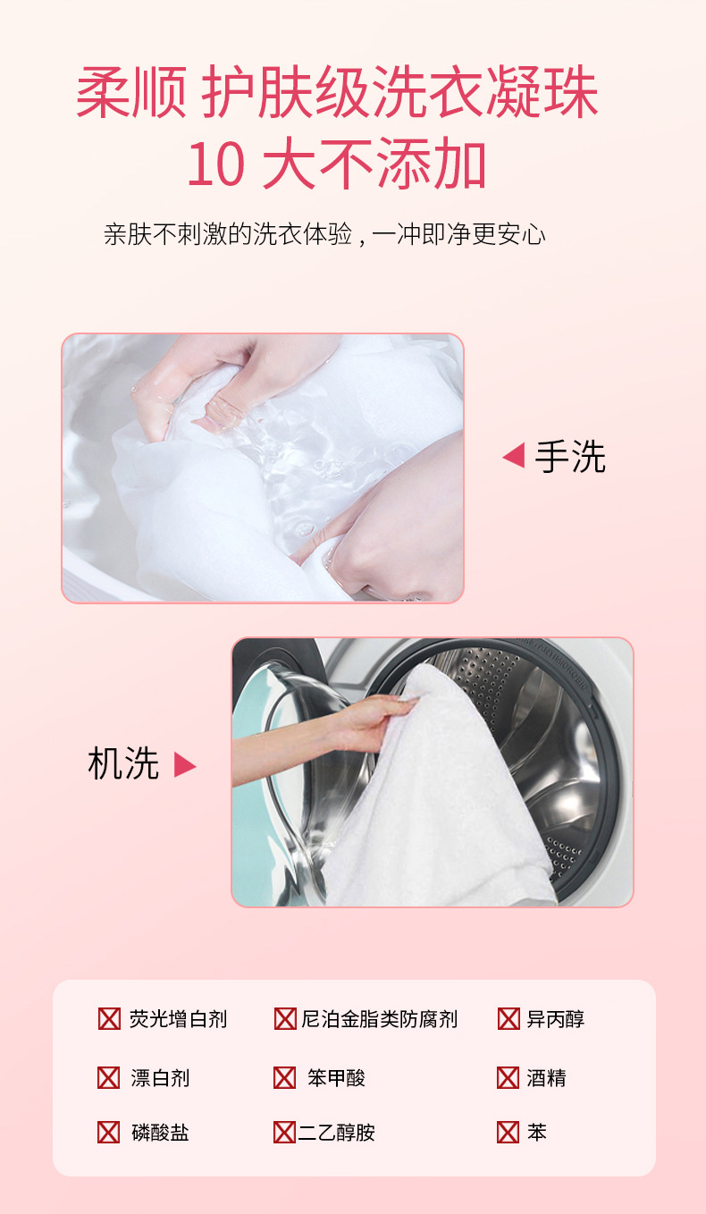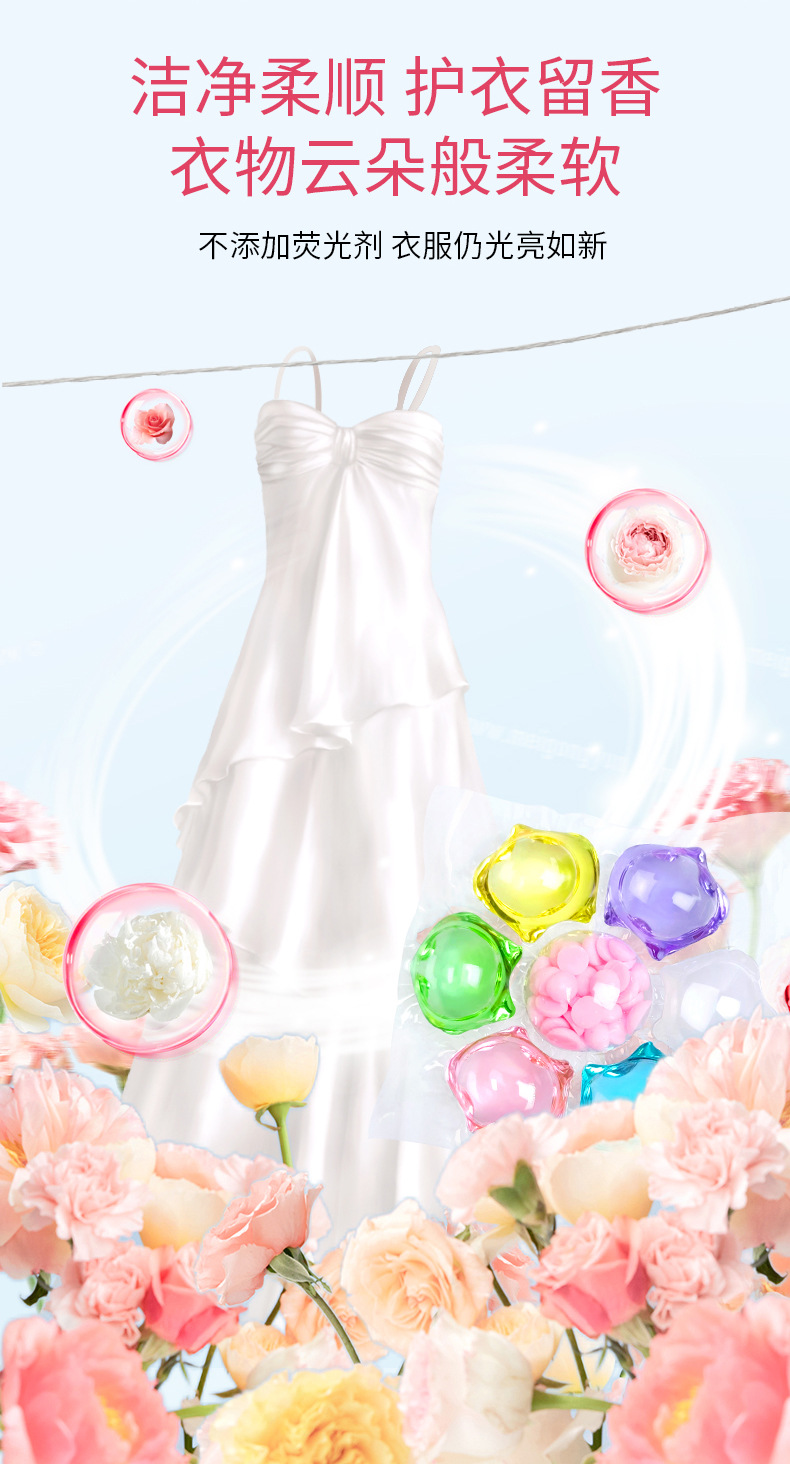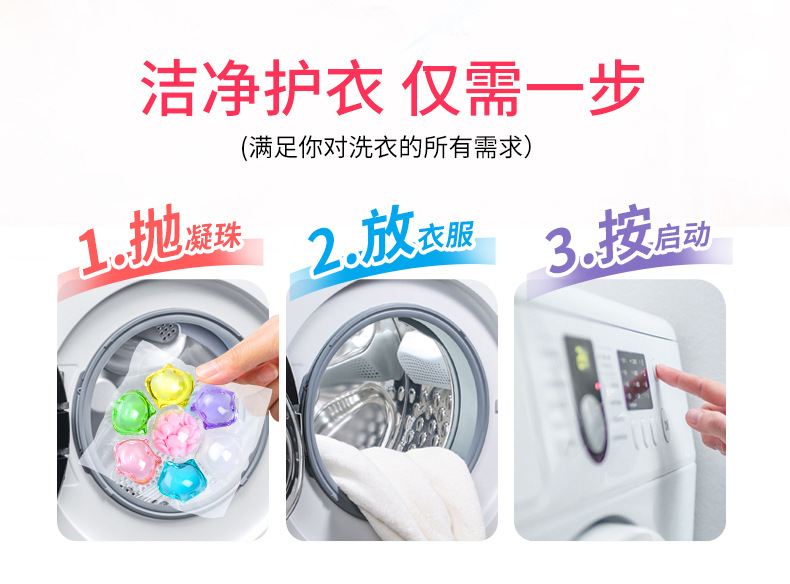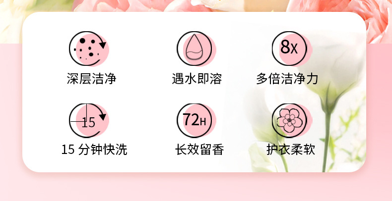 【产品特点】:含高效除污因子、多倍洁净力,不损伤衣物;多效合一,清洁、洁净、留香、一颗搞定!