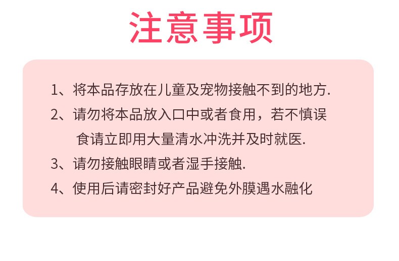 【注意事项】:1、请将本品存放在儿童及宠物接触不到的地方;2、请勿将本品放入口中或者食用,若不慎误食,请立即用大量清水冲洗并及时就医;3、请勿接触眼睛或者湿手接触 ;4、使用后请密封好本品避免外膜融化