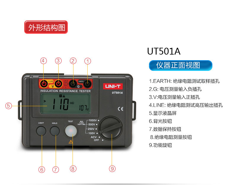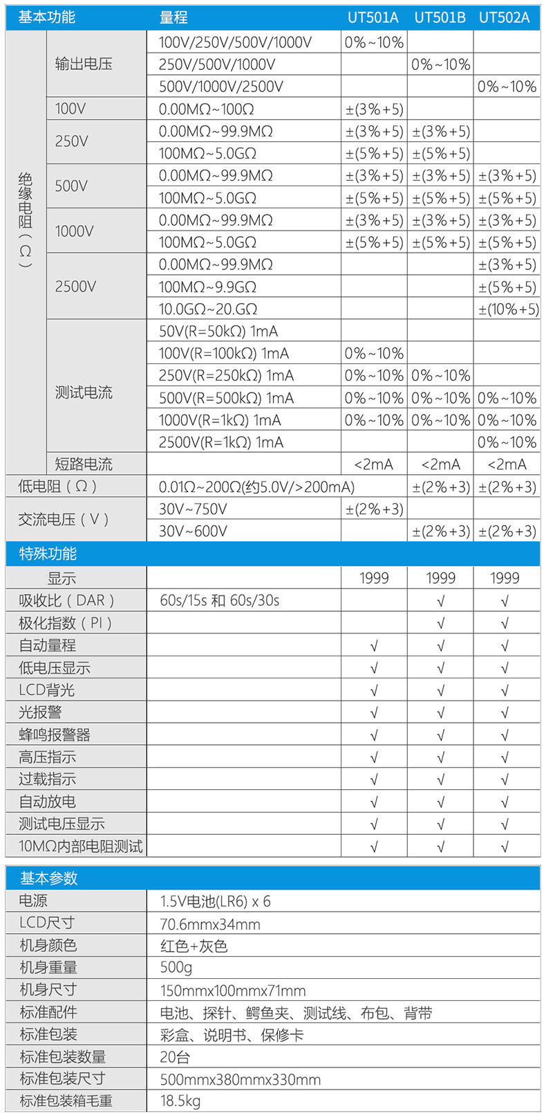 UT501A [100 В/250 В/500 В/1000 В]; UT502A [500 В/1000 В/2500 В]; UT511 [100 В/250 В/500 В/1000 В]; UT512 [500 В/1000 В/1500 В/2500 В]; UT513 [500 В/1000 В/2500 В/5000 В]; UT513A [500 В/1000 В/2500 В/5000 В]; UT501C [1000 В/5 Гб Ом]; UT502C [2500 В/20 г Ом]