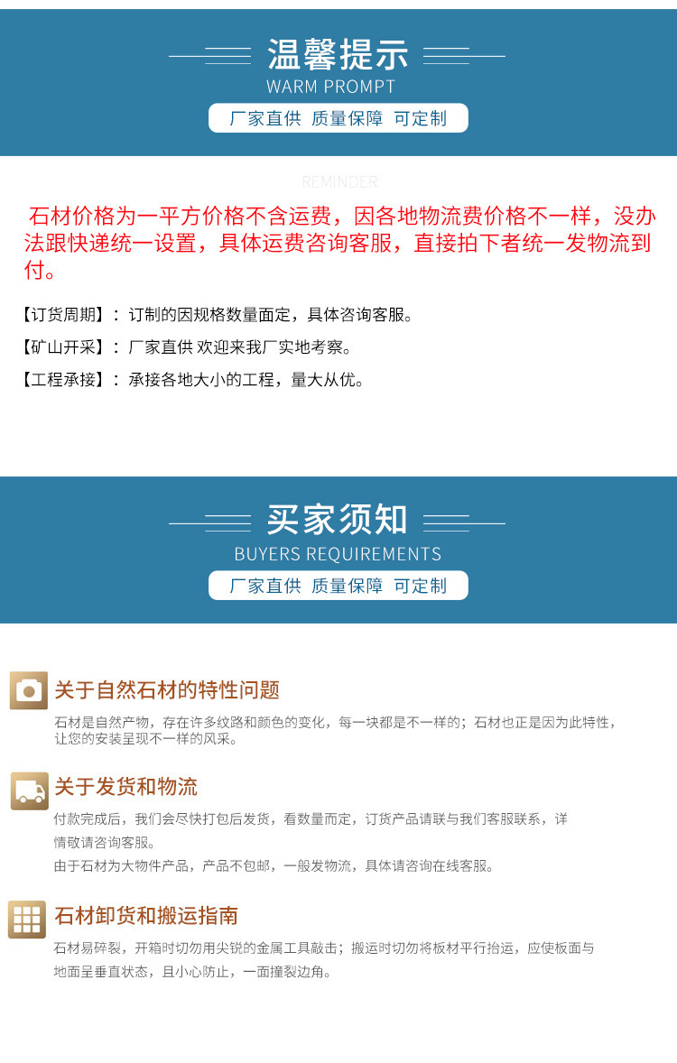 3.因为石材属于大件重物,全国物流运费不一样 具体运费咨询客服计算