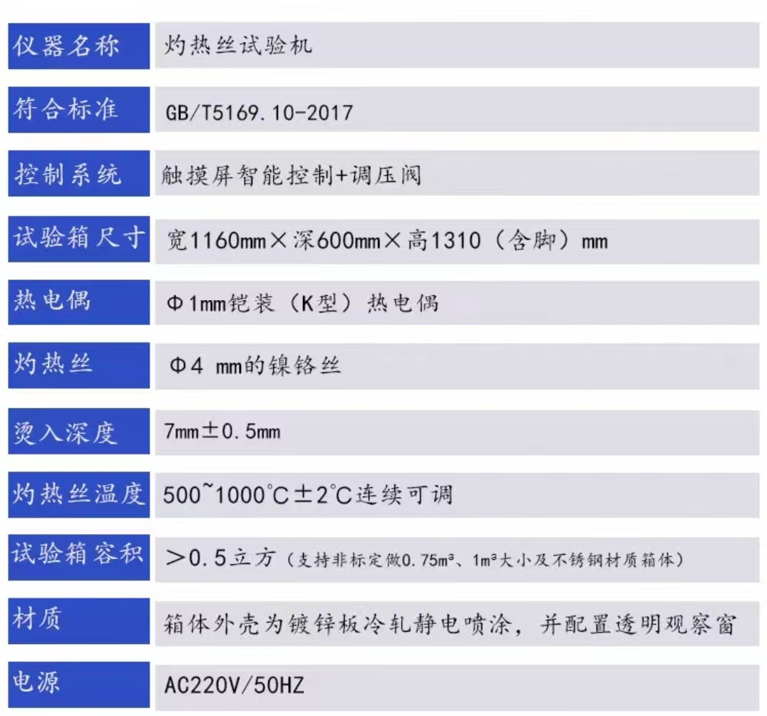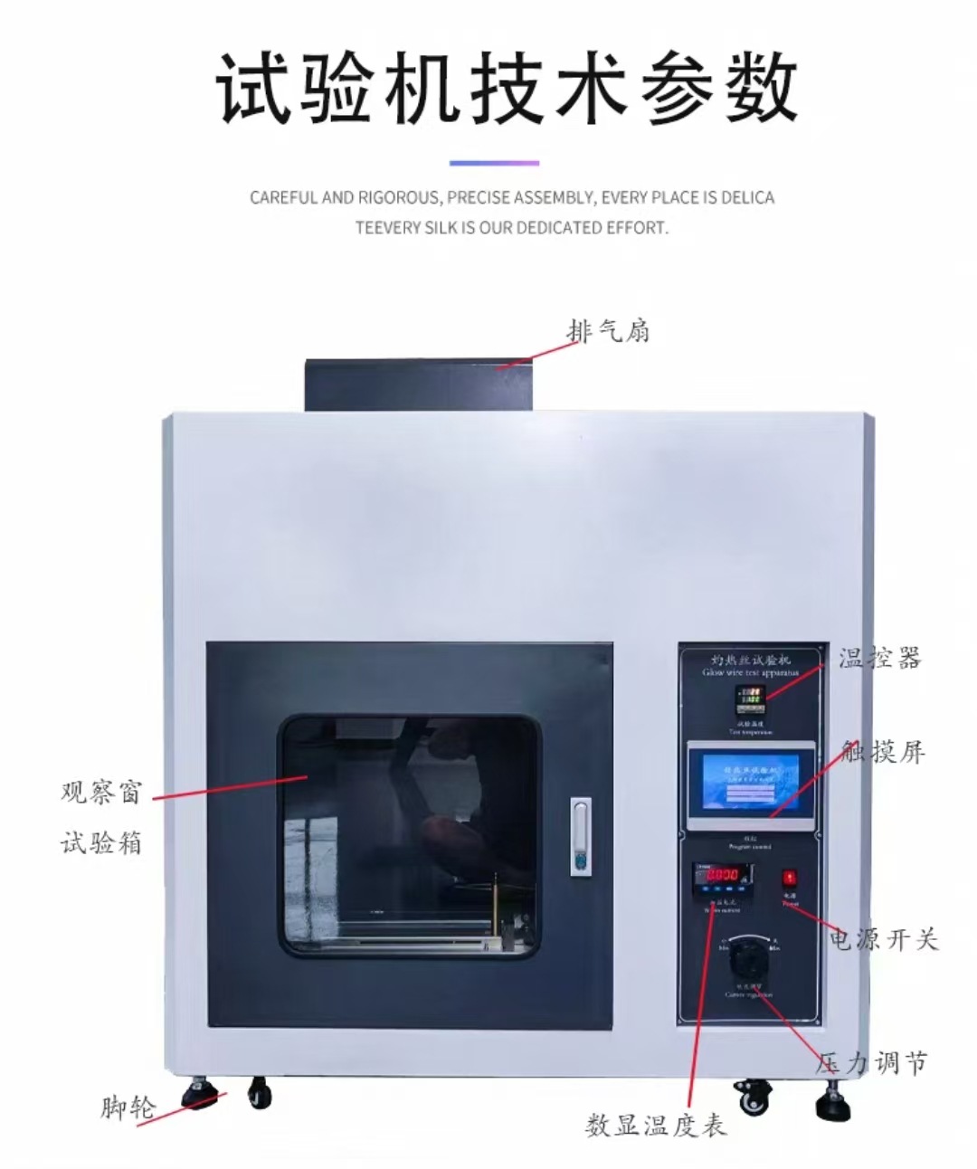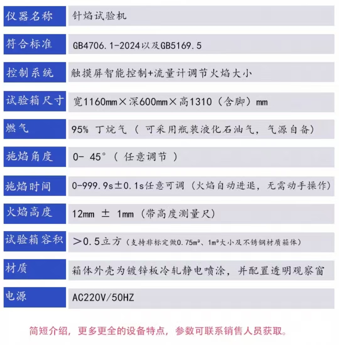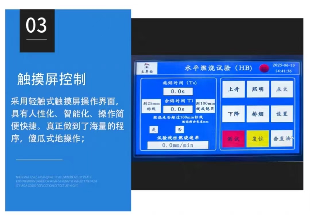 Горизонтальный вертикальный тестер горения (автоматический сенсорный экран); Тестер горячей проволоки (автоматический сенсорный экран); Тестер диэлектрической прочности (автоматический сенсорный экран); Игольчатый испытатель пламени (автоматический сенсорный экран)