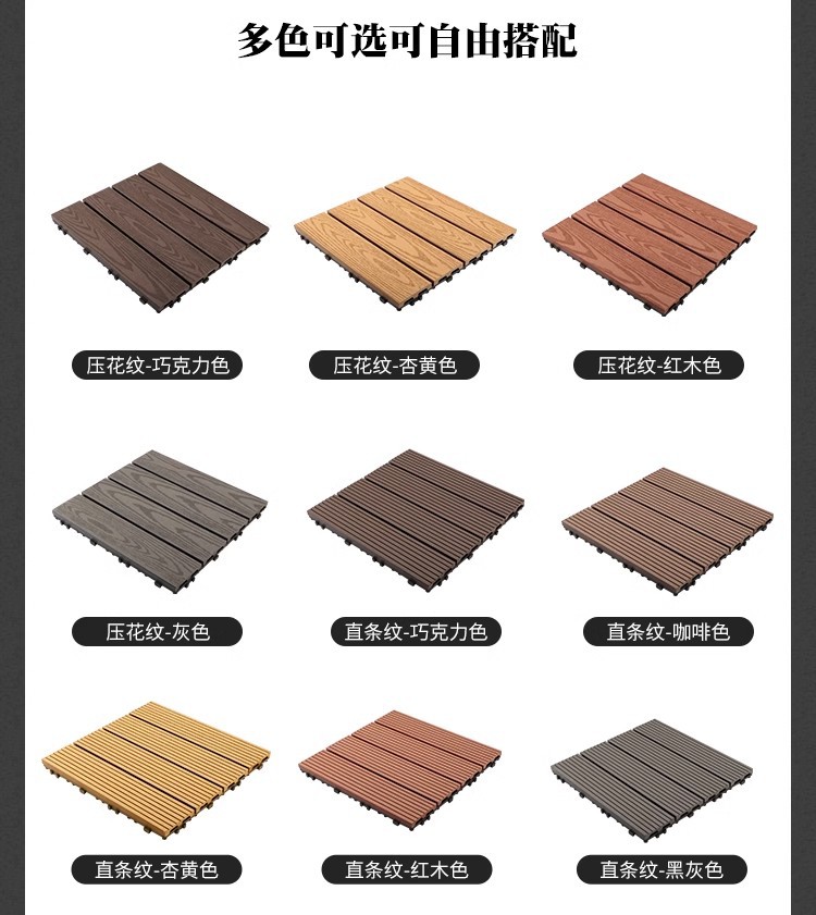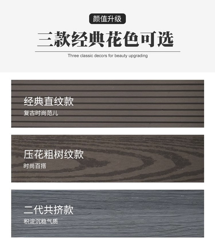 Прямой зерно-коричневый; Прямое зерно - серый; Прямое зерно-черный цвет; Прямое зерно-абрикосовый желтый; Прямые линии-шоколадный цвет; Тисненый толстый узор дерева-коричневый.; Тисненый узор из толстого дерева-серый.; Тисненый узор из толстого дерева-цвет черного дерева; Тисненый узор из толстого дерева-абрикосового желтого цвета.; Тисненый узор из толстого дерева-шоколадного цвета.; 3D тисненая модель-кофейный цвет; 3D тисненая модель-серый; 3D тисненая модель-кара-цвет; Соэкструдированный цвет палисандра второго поколения; Соэкструдированное второго поколения – серый; Соэкструдированный фей-цвет второго поколения.; Совершенствованный старинный цвет древесины второго поколения.; Соэкструдированный цвет клина второго поколения