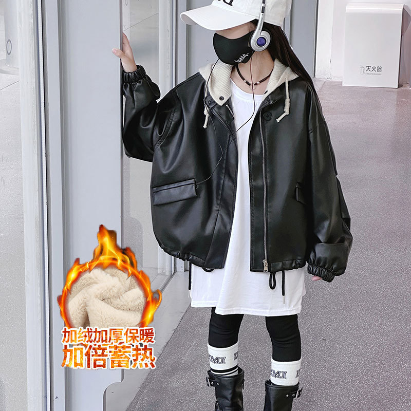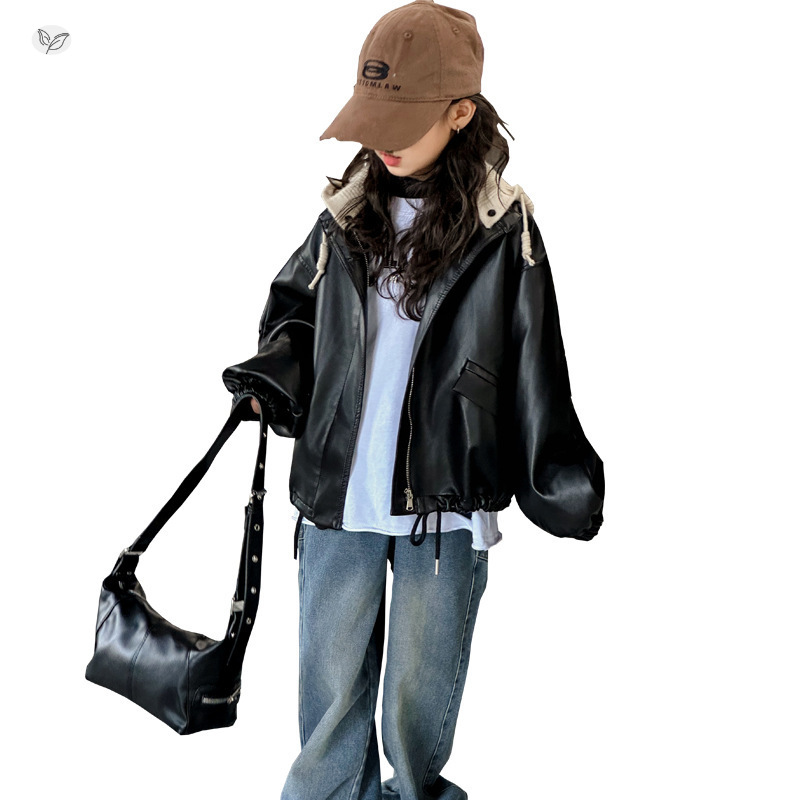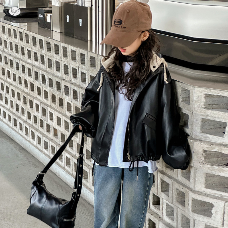 Осенняя куртка для девочек, новый стиль для детей старшего возраста, стильная свободная осенне-зимняя кожаная куртка, универсальная байкерская куртка с капюшоном для маленьких девочек.