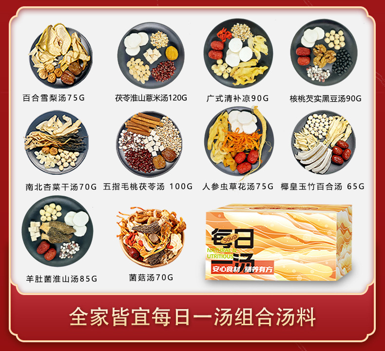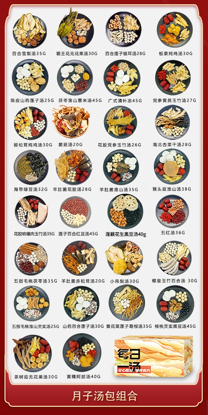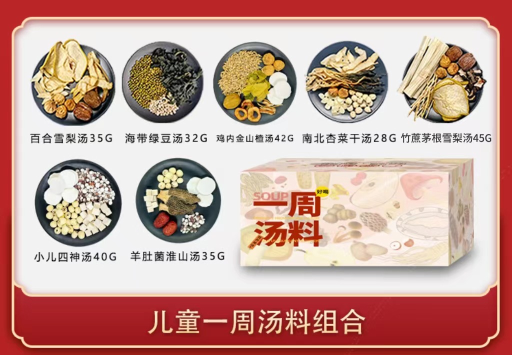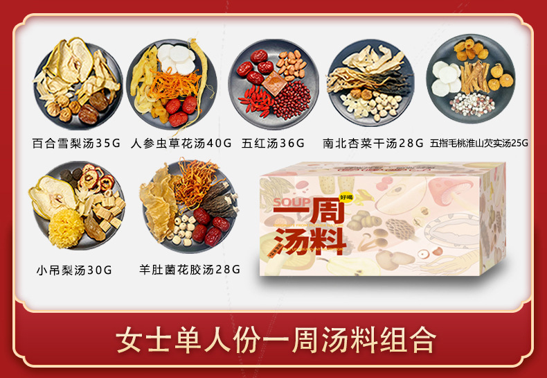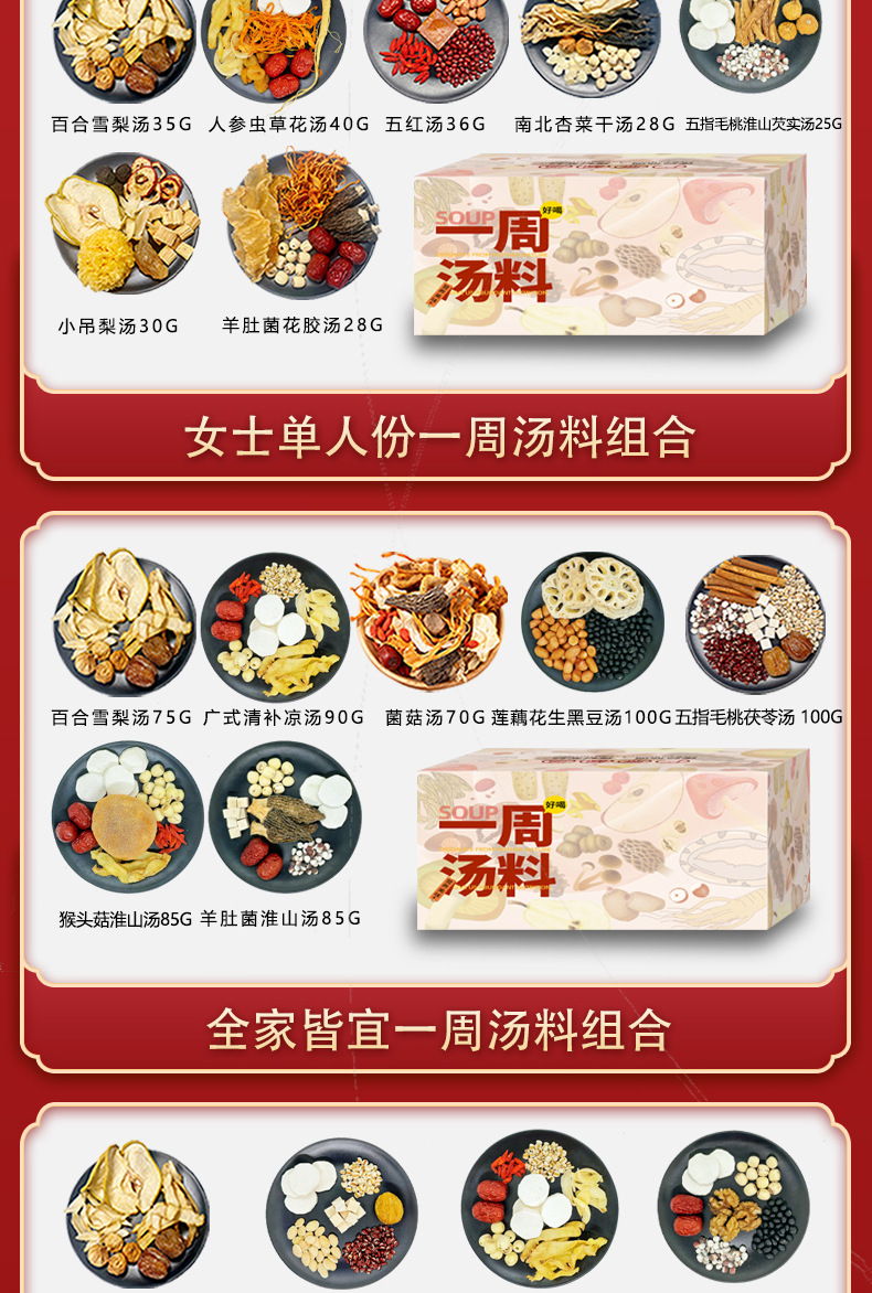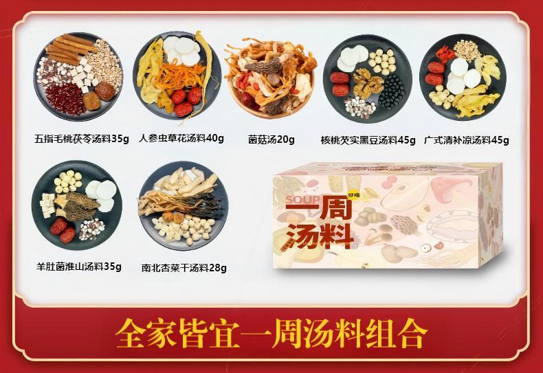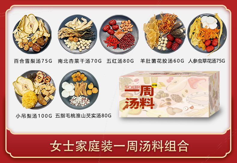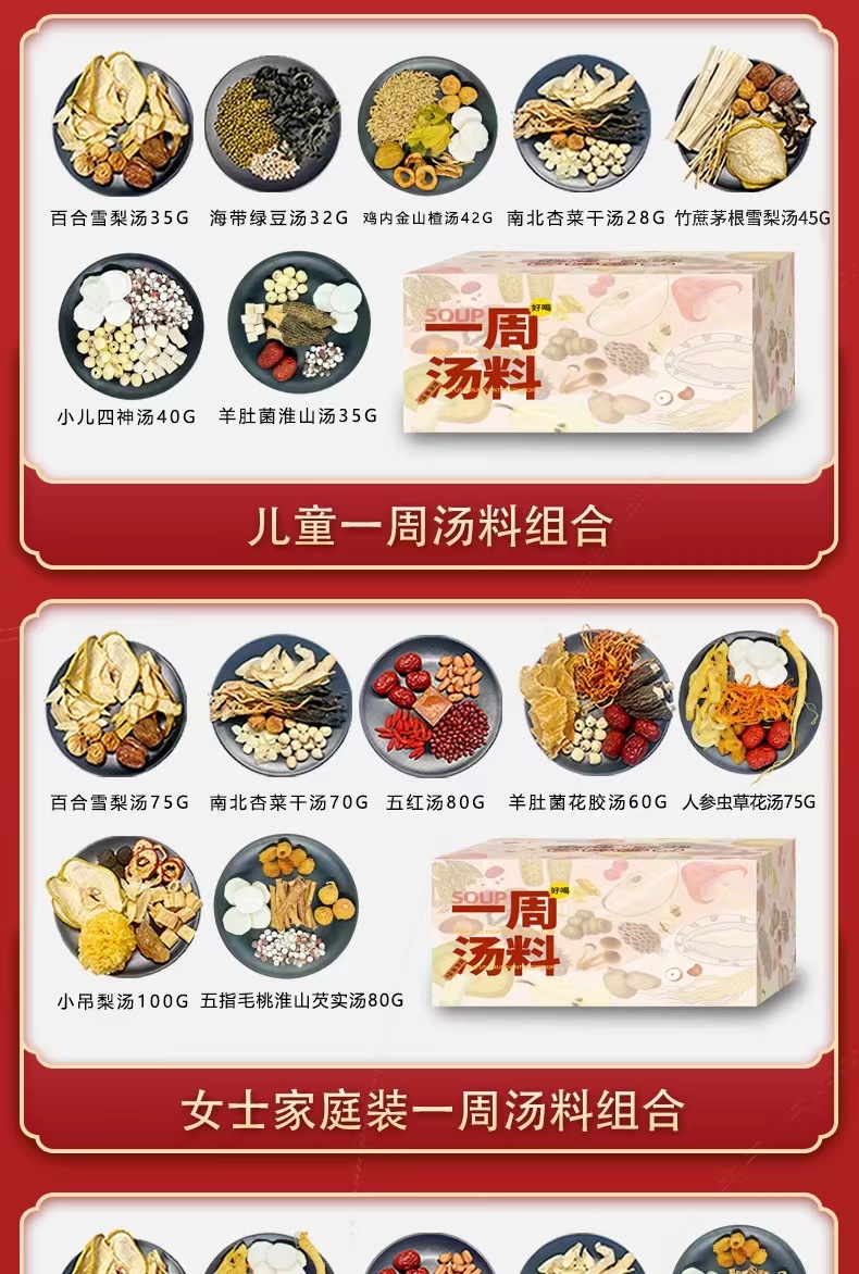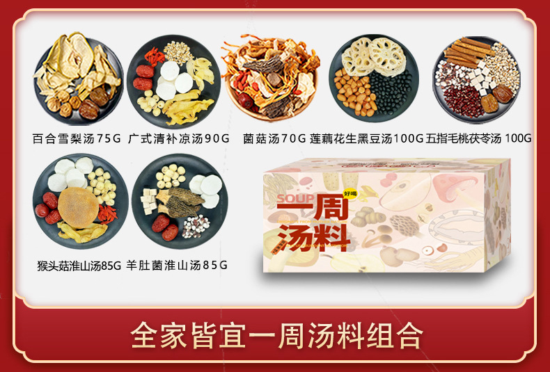 Детский суп-микс еженедельный 257г; Суповая смесь на неделю для всей семьи 248г (на 1-2 человека); Женская серия суп-комбинация на неделю 222г (на 1-2 человека); Женская серия, семидневный семейный пакет 540г (на 3-4 человека); Однонедельная суповая комбинация для всей семьи 605г; Комбинация ежедневного супа, подходящая для всей семьи, 840 г.; 30-й день послеродовой суповой комбинации 973 г.