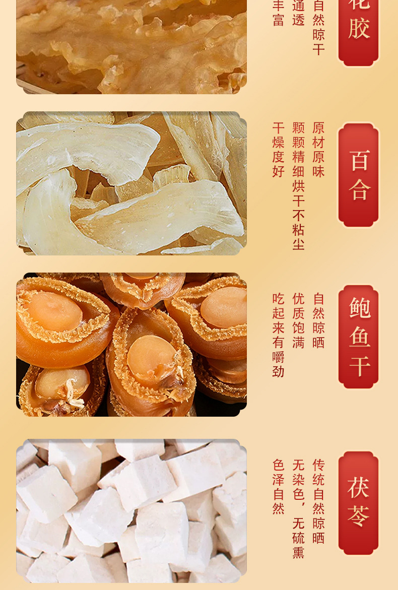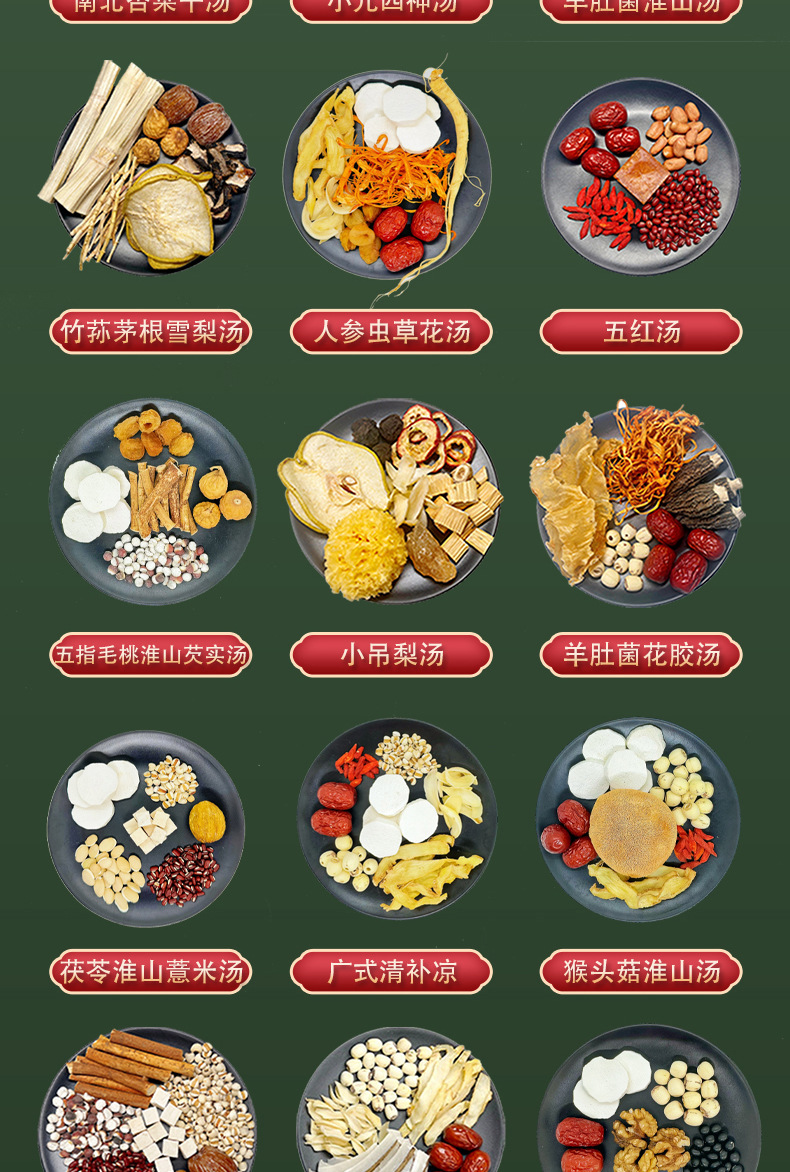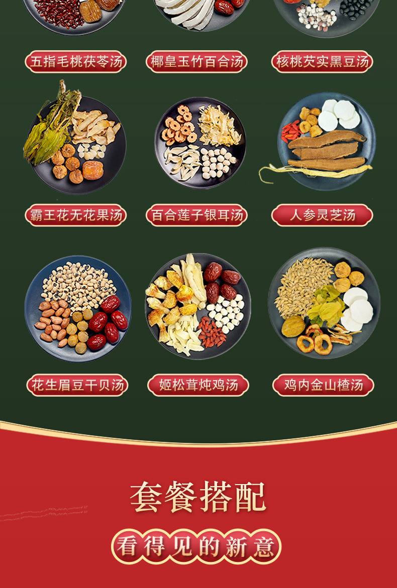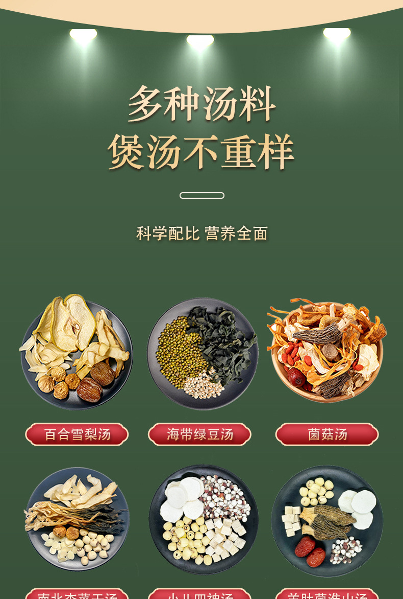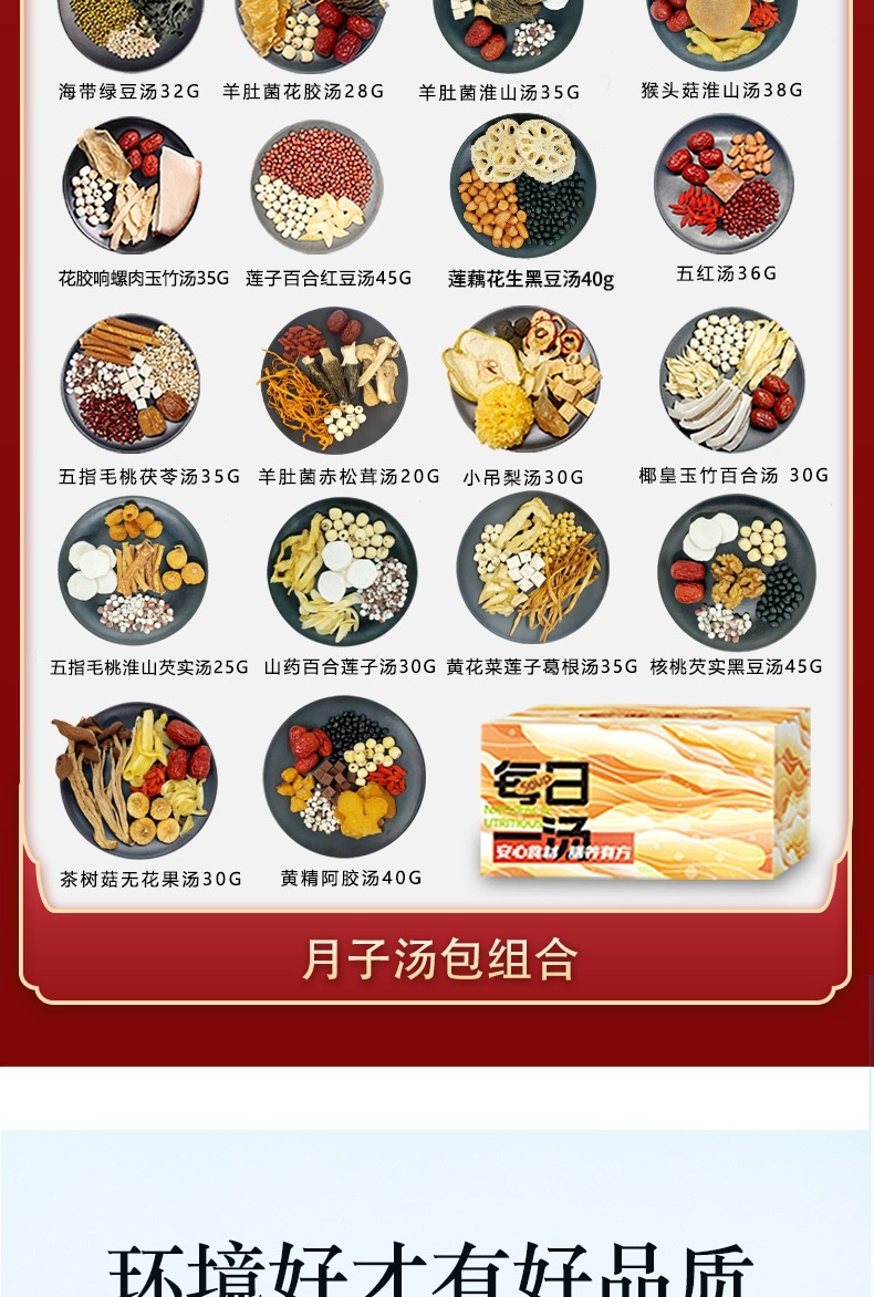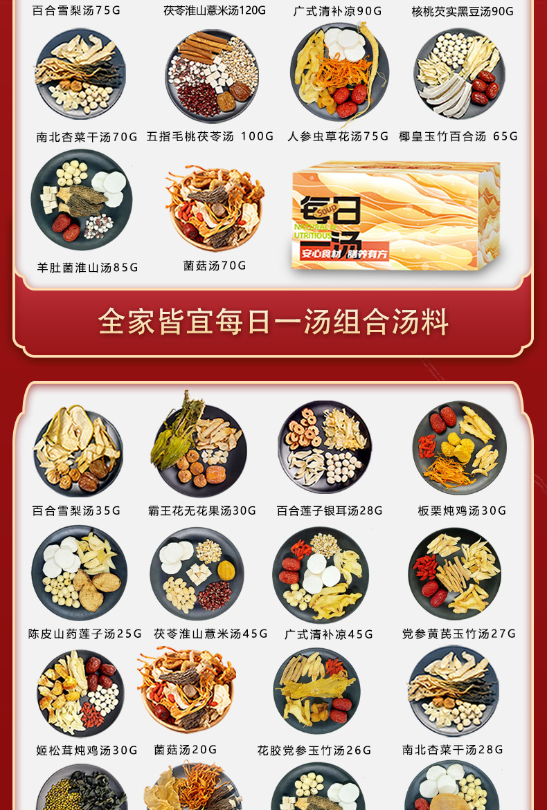 Детский суп-микс еженедельный 257г; Суповая смесь на неделю для всей семьи 248г (на 1-2 человека); Женская серия суп-комбинация на неделю 222г (на 1-2 человека); Женская серия, семидневный семейный пакет 540г (на 3-4 человека); Однонедельная суповая комбинация для всей семьи 605г; Комбинация ежедневного супа, подходящая для всей семьи, 840 г.; 30-й день послеродовой суповой комбинации 973 г.