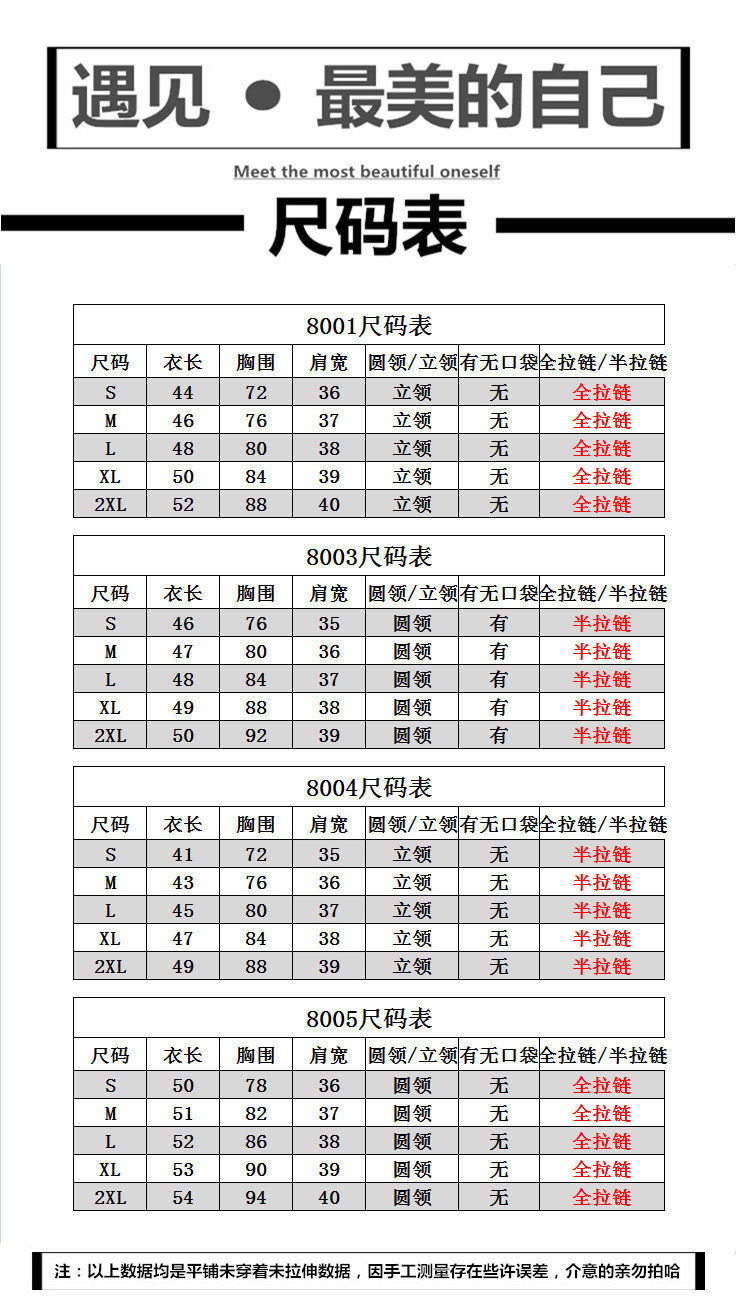 8001 белая куртка; 8001 каменно-серая куртка; 8001 кофейная куртка; 8001 черная куртка; 8001 розово-красная куртка; 8001 светло-зеленая куртка; 8001 сиреневый пиджак; 8001 желтая куртка; 8001 темно-фиолетовая куртка; 8001 куртка из порошка корня лотоса; 8001 серо-синяя куртка; 8003 куртка королевского синего цвета; 8003 куртка из порошка корня лотоса; 8003 черная куртка; 8004 куртка королевского синего цвета; 8004 белое пальто; 8004 черная куртка; 8005 куртка королевского синего цвета; 8005 бордовая куртка; 8005 черная куртка