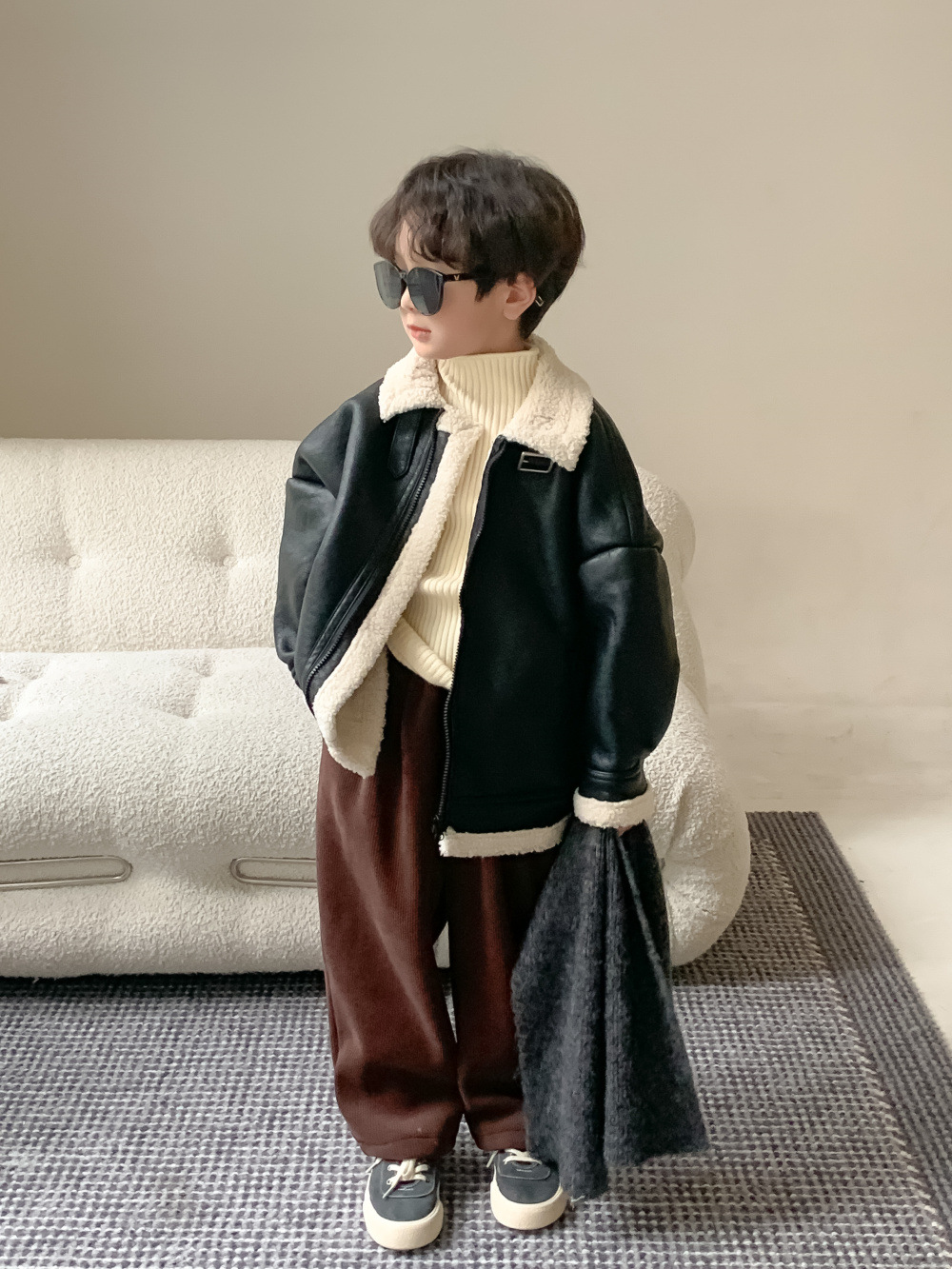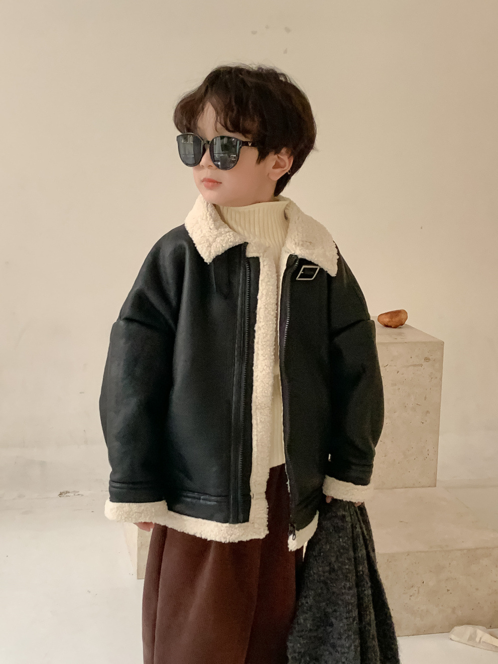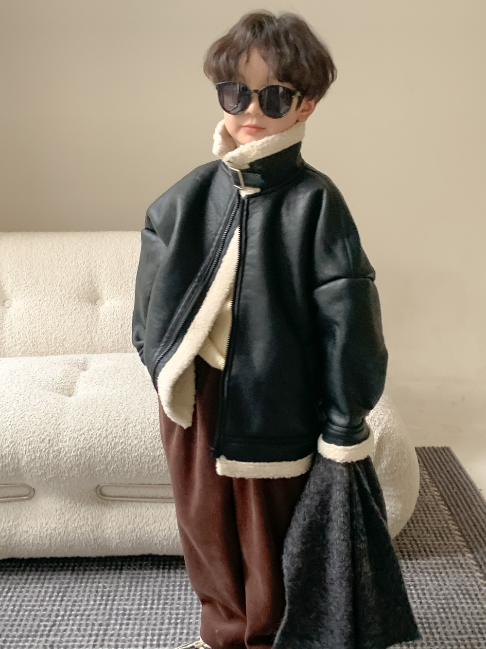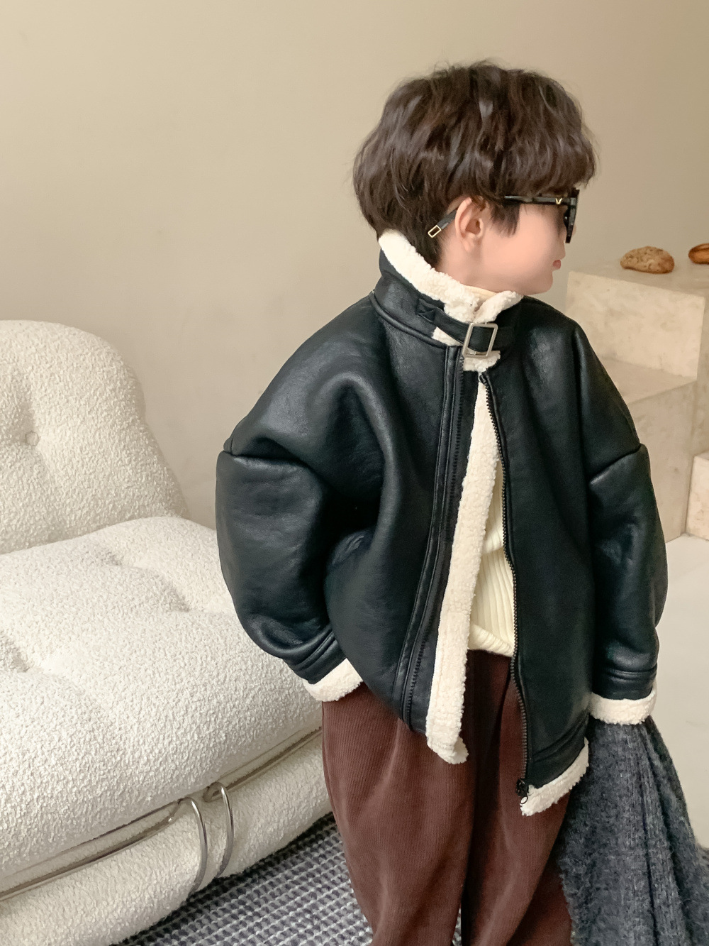 Детская зимняя куртка 2025 для мальчиков в корейском стиле, повседневная кожаная куртка с меховым воротником, утепленная кожаная куртка на молнии для детей