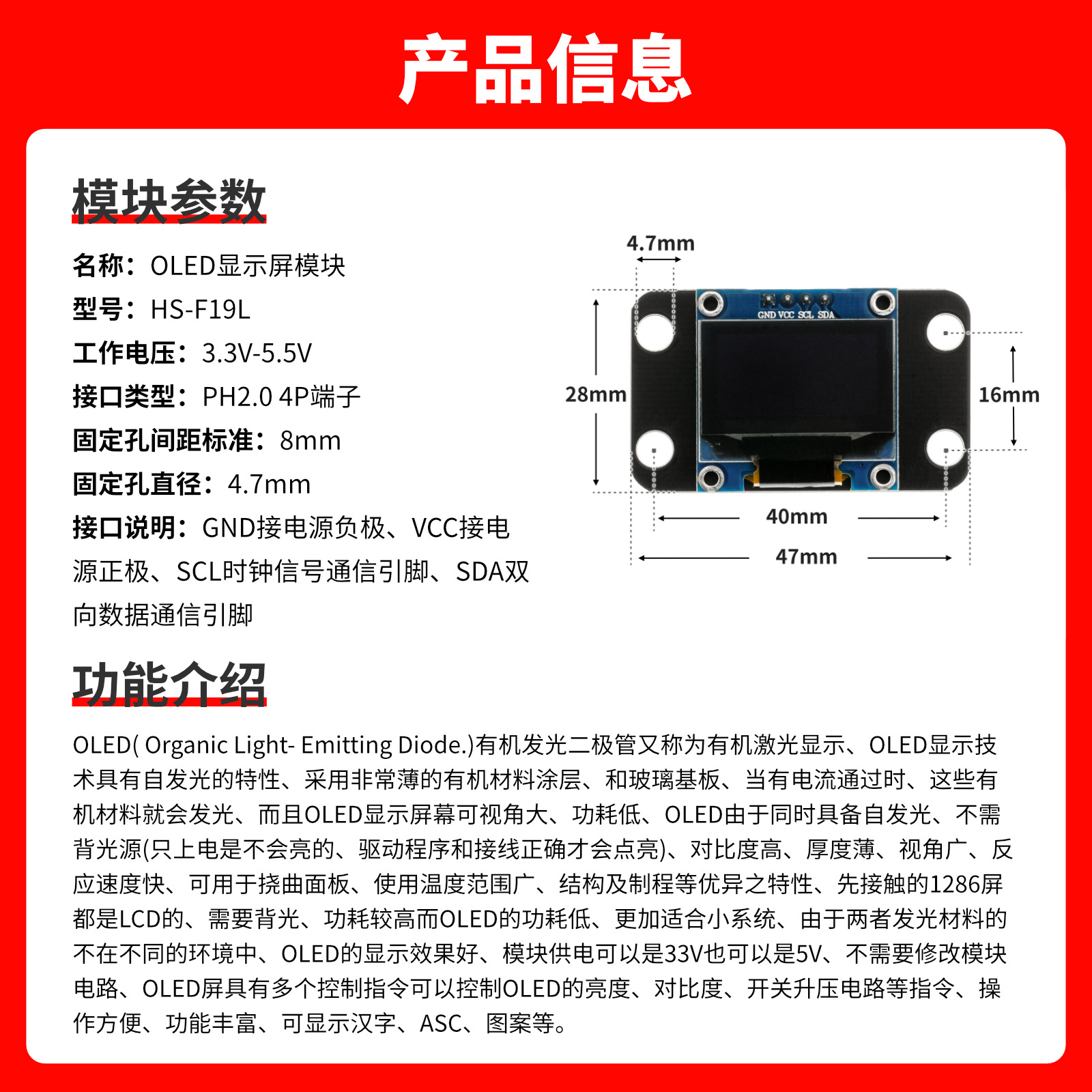 OLED( Organic Light- Emitting Diode.)有机发光二极管又称为有机激光显示、OLED显示技术具有自发光的特性、采用非常薄的有机材料涂层、和玻璃基板、当有电流通过时、这些有机材料就会发光、而且OLED显示屏幕可视角大、功耗低、OLED由于同时具备自发光、不需背光源(只上电是不会亮的、驱动程序和接线正确才会点亮)、对比度高、厚度薄、视角广、反应速度快、可用于挠曲面板、使用温度范围广、结构及制程等优异之特性、先接触的1286屏都是LCD的、需要背光、功耗较高而OLED的功耗低、更加适合小系统、由于两者发光材料的不在不同的环境中、OLED的显示效果好、模块供电可以是33V也可以是5V、不需要修改模块电路、OLED屏具有多个控制指令可以控制OLED的亮度、对比度、开关升压电路等指令、操作方便、功能丰富、可显示汉字、ASC、图案等。
