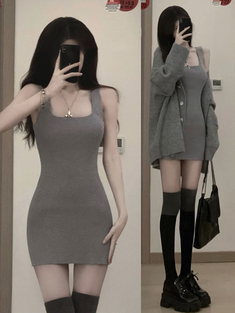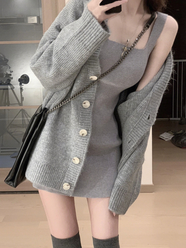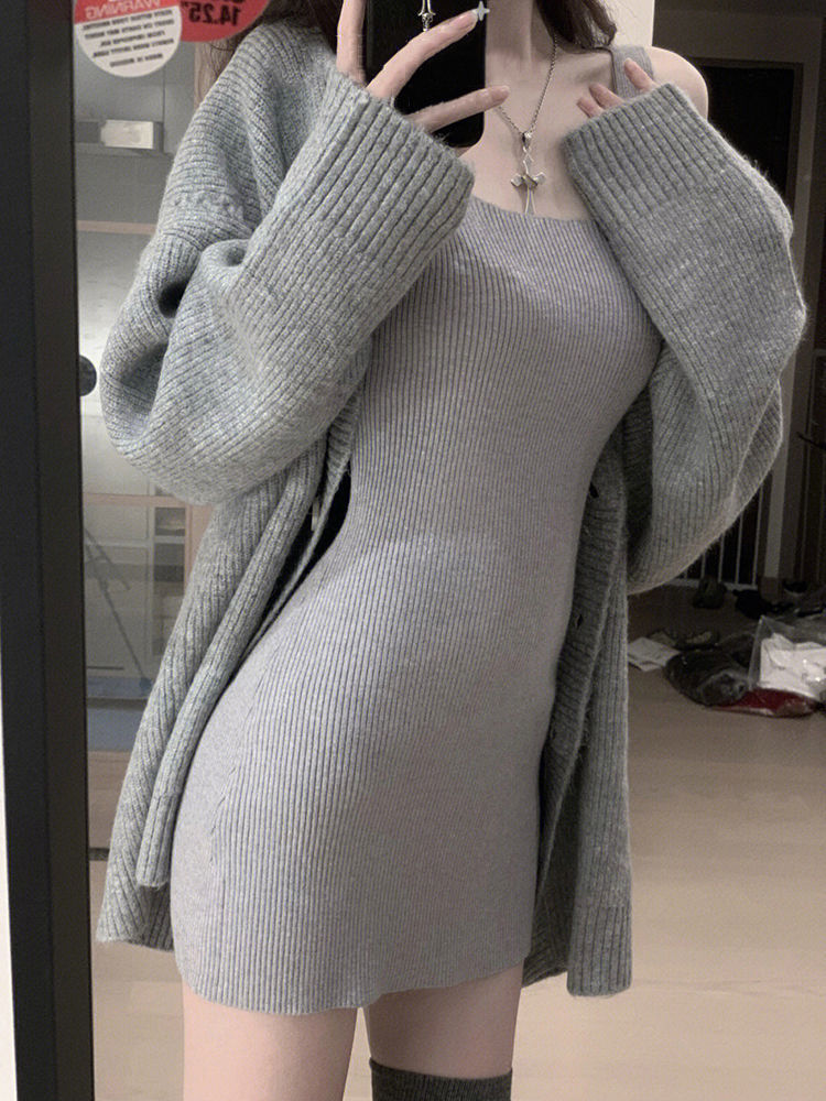 Серый Слип Юбка; Серый кардиган; Юбка-двойка + кардиган