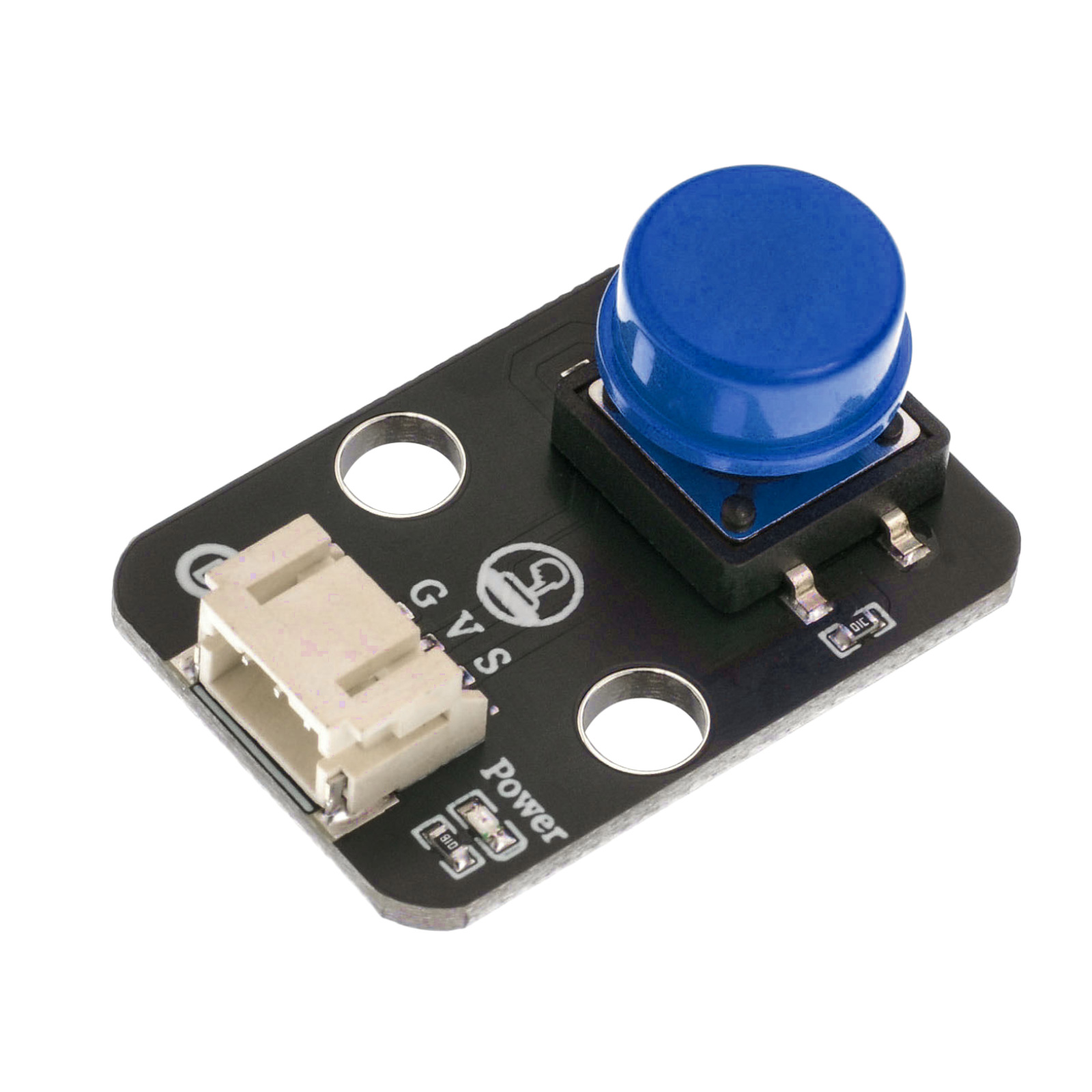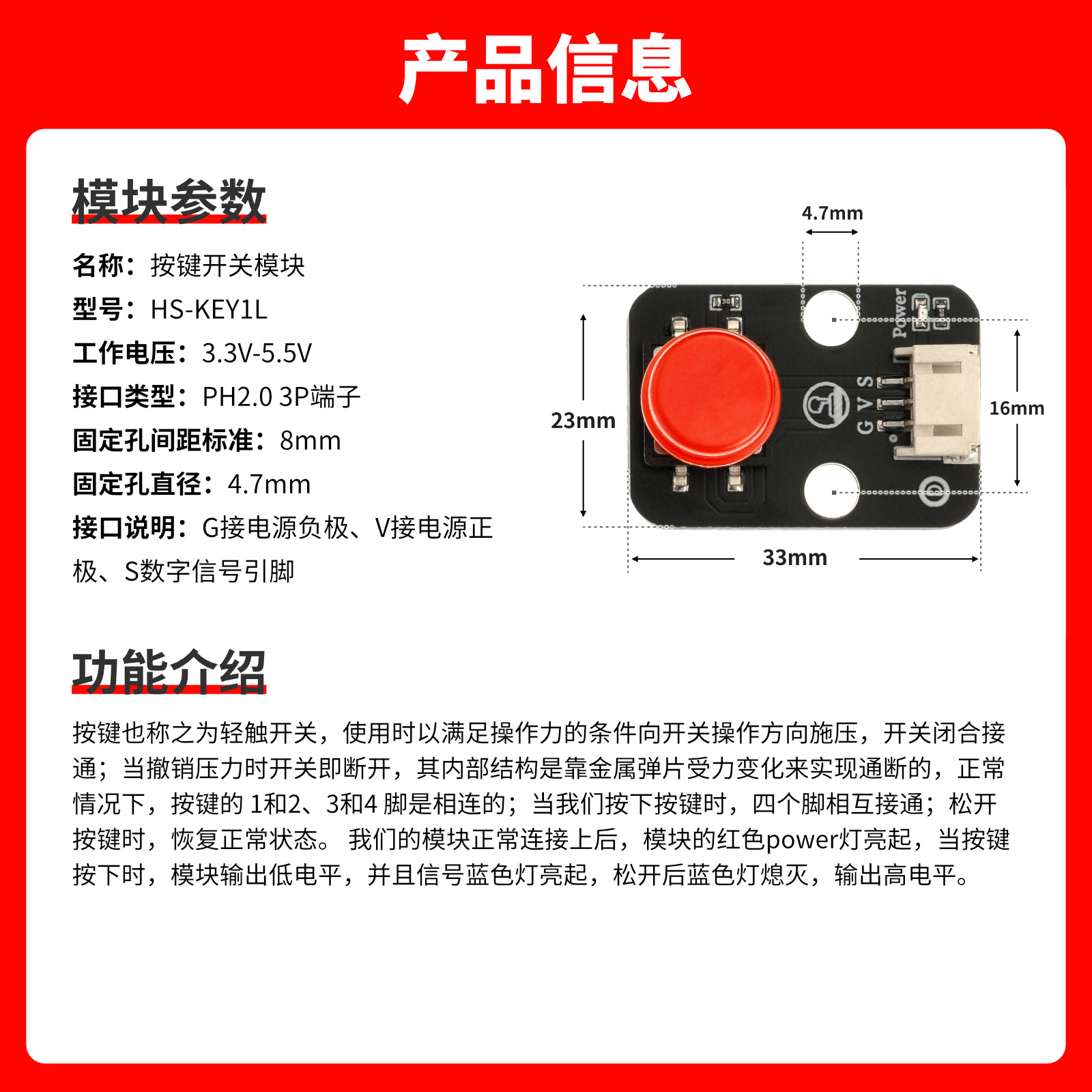 按键也称之为轻触开关,使用时以满足操作力的条件向开关操作方向施压,开关闭合接通;当撤销压力时开关即断开,其内部结构是靠金属弹片受力变化来实现通断的,正常情况下,按键的 1和2、3和4 脚是相连的;当我们按下按键时,四个脚相互接通;松开按键时,恢复正常状态。 我们的模块正常连接上后,模块的红色power灯亮起,当按键按下时,模块输出低电平,并且信号蓝色灯亮起,松开后蓝色灯熄灭,输出高电平。