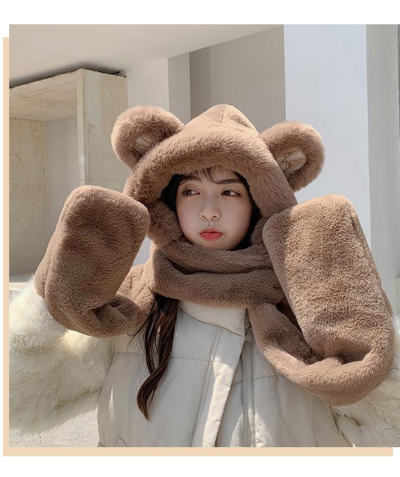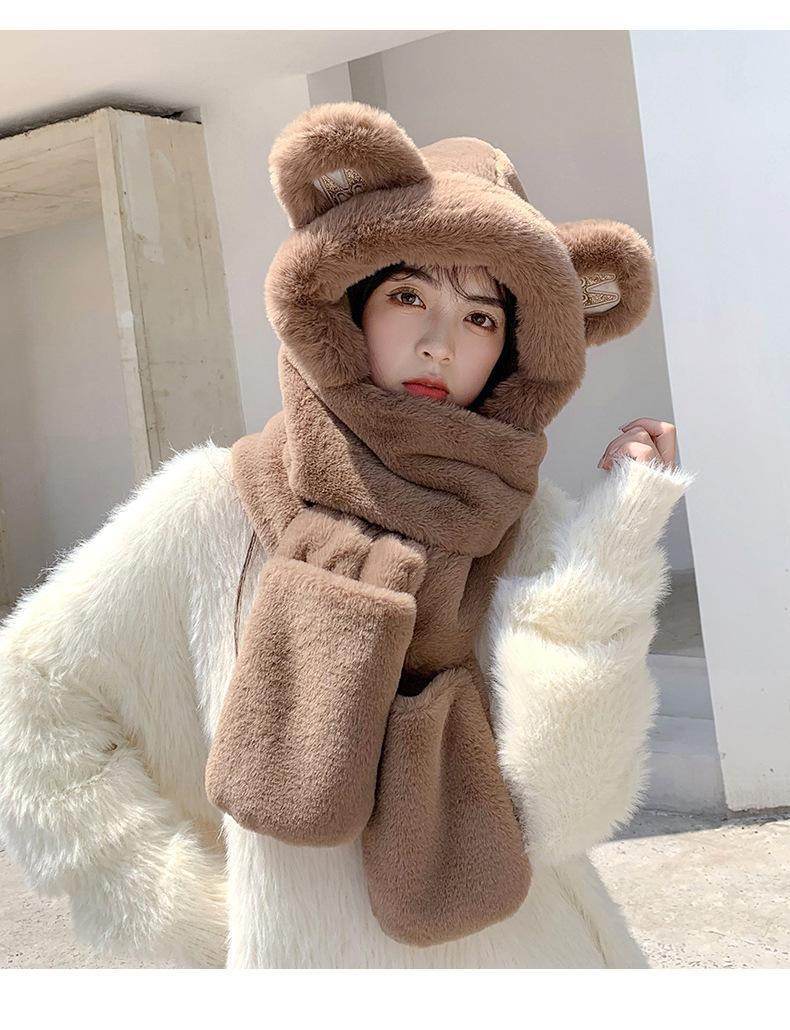 Шапка-медведь с флисовой подкладкой, толстая плюшевая шапка для женщин, зимняя шапка, шапка со встроенным шарфом, комплект из трех предметов, милая и универсальная.