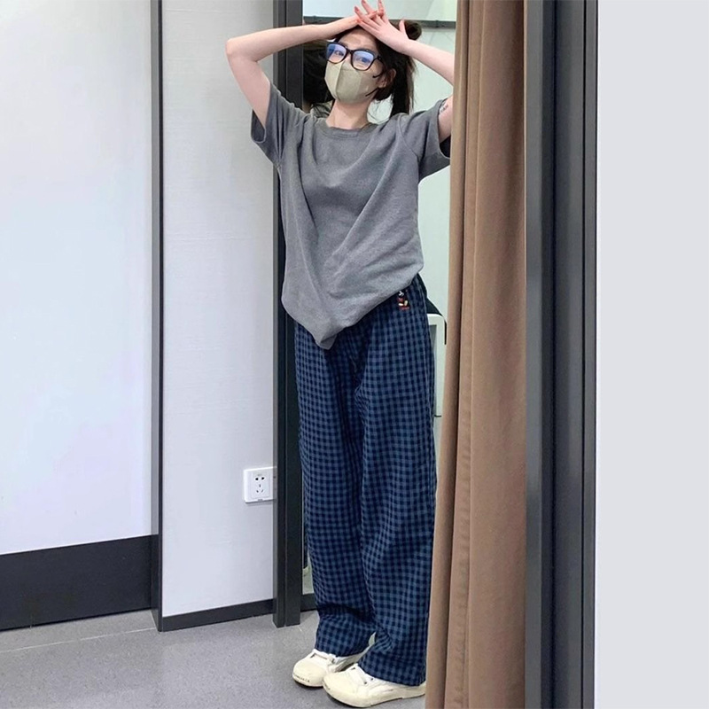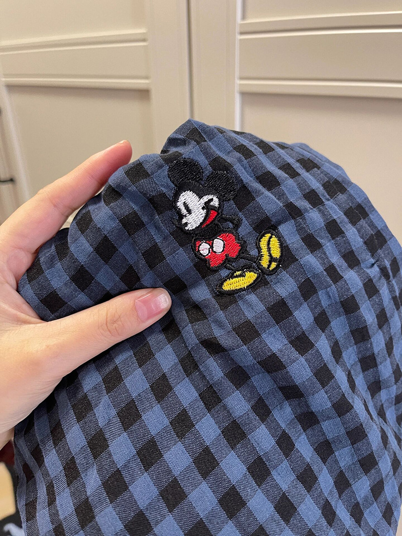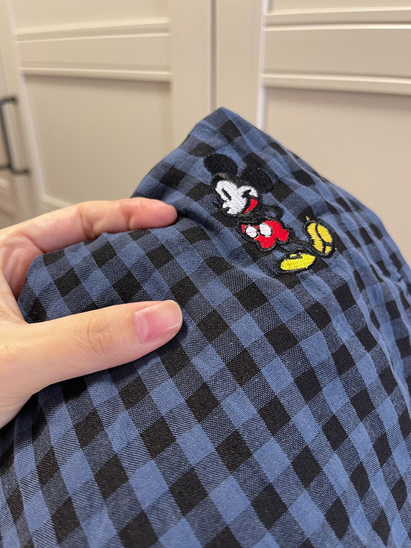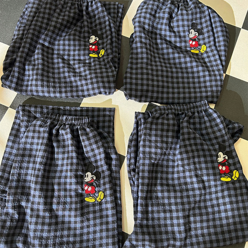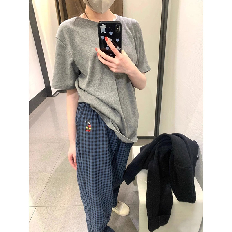 Брюки в клетку Микки с вышивкой; Серый топ с короткими рукавами; Серые короткие рукава + брюки в клетку Микки.