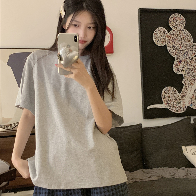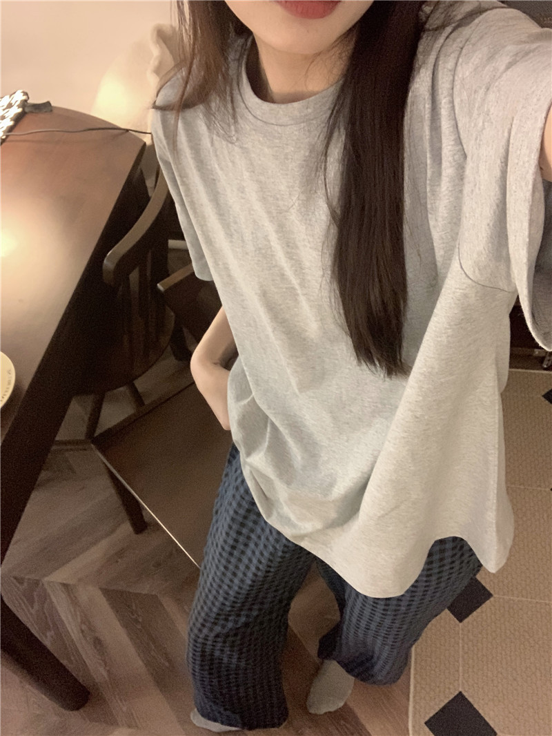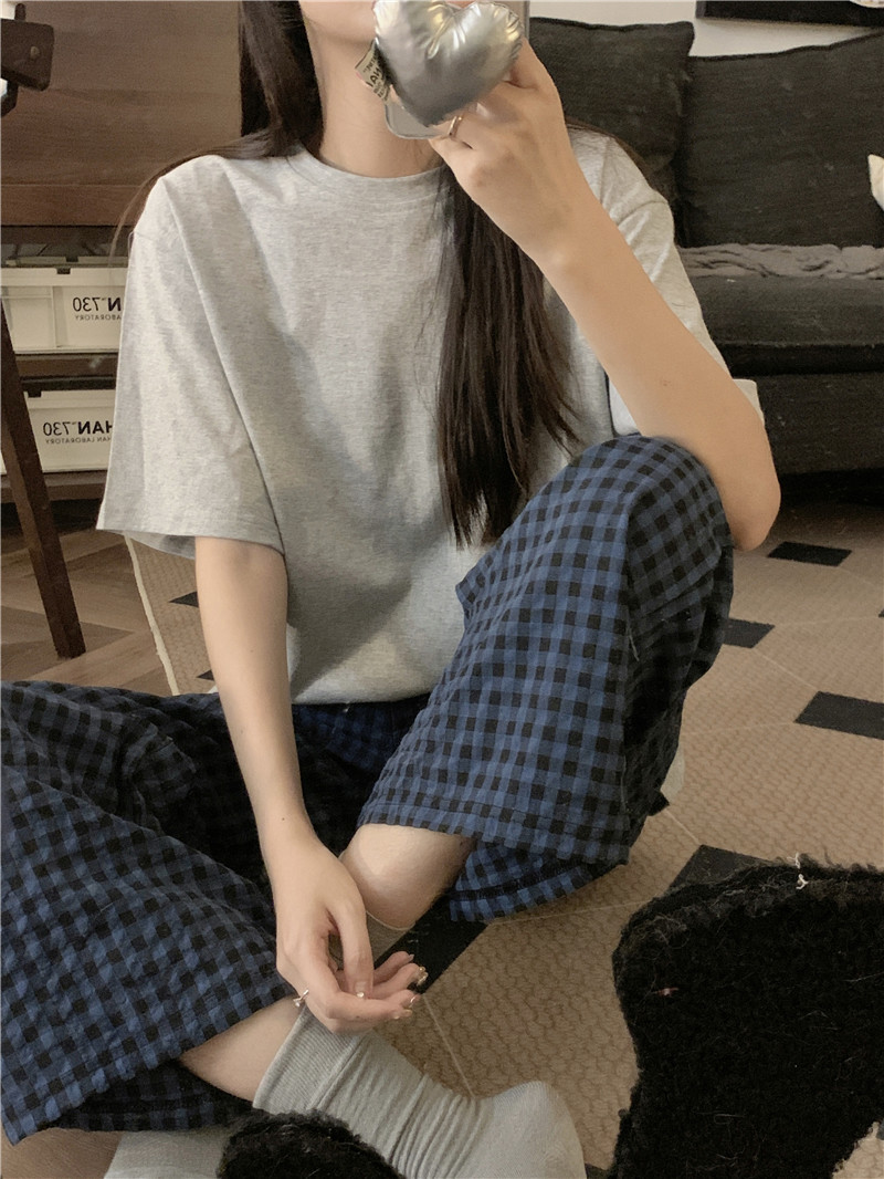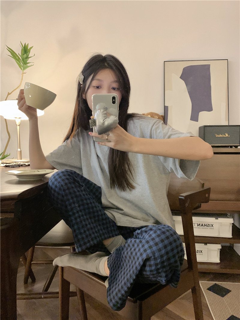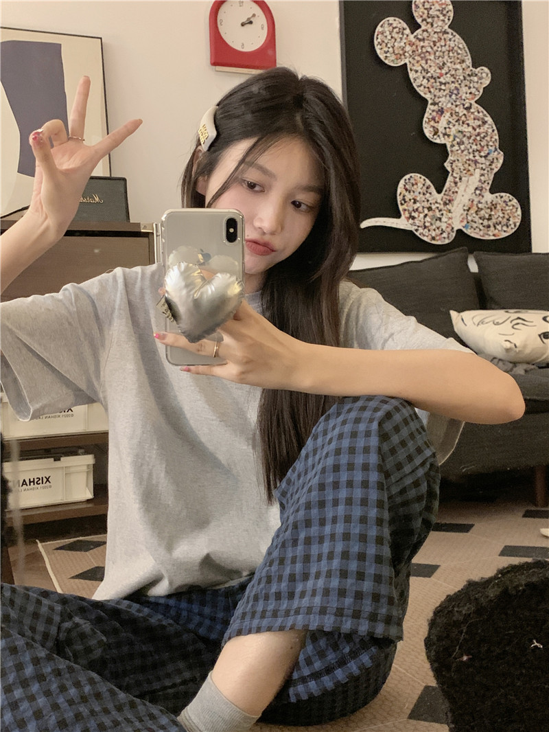 Брюки в клетку Микки с вышивкой; Серый топ с короткими рукавами; Серые короткие рукава + брюки в клетку Микки.